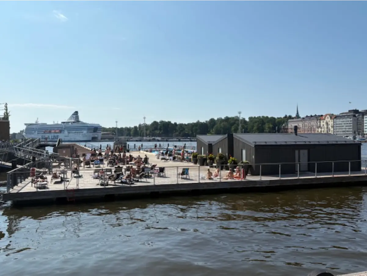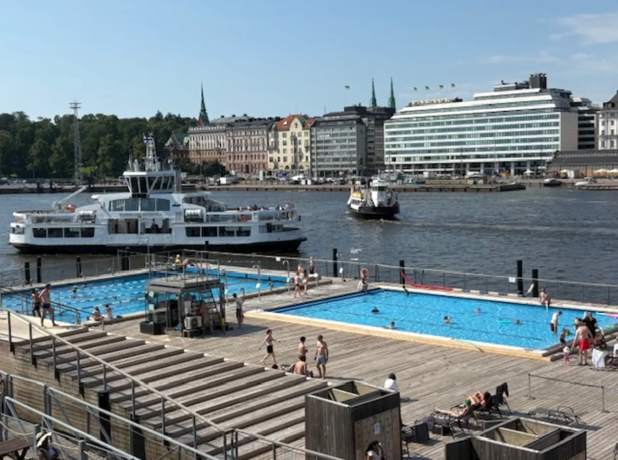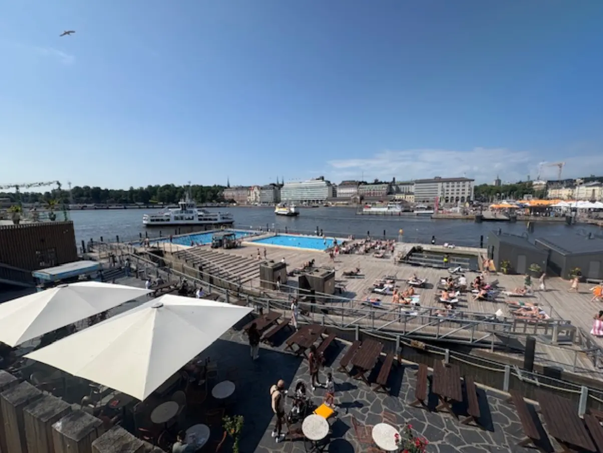 Zu Fuss geht es weiter zur heimlichen Nummer 1 in Helsinki, den Allas Sea Pools, ja genau einem Schwimmbad. Es ist direkt im Hafen integriert worden, die „locals“ aalen sich in der Sonne und nehmen eine kühle Erfrischung im Becken. Ja und zugegeben, es gibt nicht viele Städte wo der Pool in der Nähe des Hafenbeckens platziert wurde, spontan fällt mir da noch Monaco ein. Nebenan genießt der allgemeine Tourist ein kühles Getränk oder einen Kaffee, schaut dabei den ankommenden und ausfahrenden Schiffen zu.