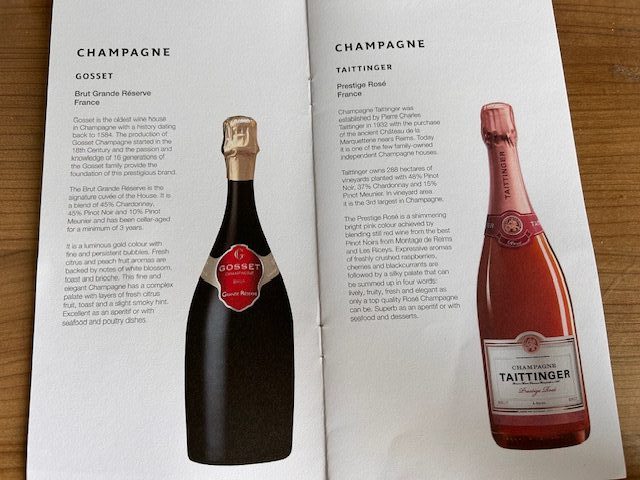 Die werden nicht nur am Sitz serviert. Im Eingangsbereich auf Höhe der 2. Tür ist eine Art Bar aufgebaut. Ein paar Crips sind ausgelegt, ein schöner Rosenstrauß Blumen und wer mal einige Minuten im Stehen verharren möchte der findet hier eine Anlaufstelle. Der Weinkeller von Qatar macht wieder auf „dicke Hose“ und das startet mit 2 Champagnern. Der Gosset Brut Grande Réserve und ein guten Taittinger Prestige Rosé sind eine Ansage. Beide verfügen über einen hohen Anteil Chardonnay, auch wenn der Taittinger logischer Weise beim Pinot Noir die Nase vorne hat. Der Saint Clair Chardonnay ist ebenfalls ein Reserve, wurde in Neuseeland in Marlborough angebaut und gekeltert. 9 Monate in amerikanischen Holz geben diesem vielschichtige Aromen, wie Ananas oder Nektarine. Das karamellige am Gaumen sorgt für reichlich Nachhall, ein sehr schöner Tropfen über den Wolken! Ergänzt wird die Weinliste von einem Sauvignon Blanc aus der Region Adelaide, einem Rose aus Frankreich, um genau zu sein der Provence, der auf den Namen Wispering Angel getauft wurde.