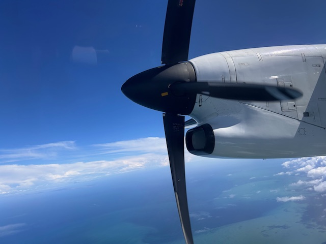 Wenn es dann Boarding heißt merkt man schnell hier ist etwas anders! Es geht ohne X-RAY direkt auf das Rollfeld in den Flieger. Keine Sicherheitskontrolle, dass war schon 1997 so, bei meinem ersten Aufschlag in der Region. Seit 9/11 eigentlich undenkbar, hier ganz normal und mit einer stoischen Ruhe die das Vertrauen untereinander fördert, wenn man das so sagen kann. Der Flug wird in einer Q300 ausgeführt, die 2 motorigen Maschine mit 50 Sitzen. Sitz 3A vor dem Propeller, garantiert eine grandiose Sicht bei Start und Landung. In Sachen Getränke sei gesagt, ein Glas Wasser, Kaffee oder Tee ist in dieser Stunde die Qual der Wahl, nicht mehr und nicht weniger.