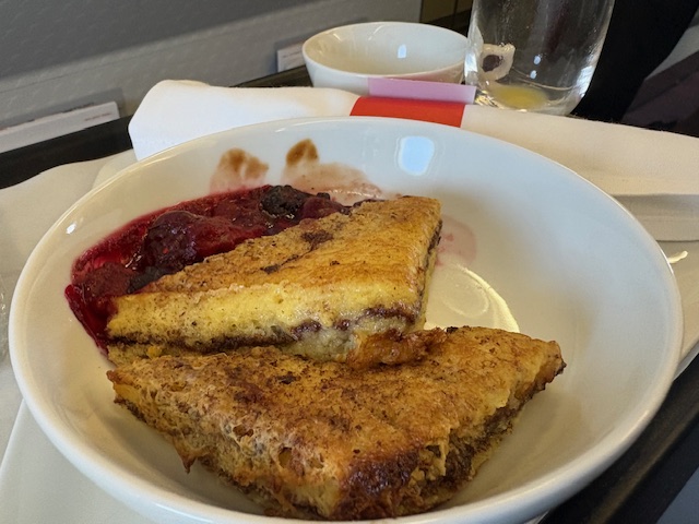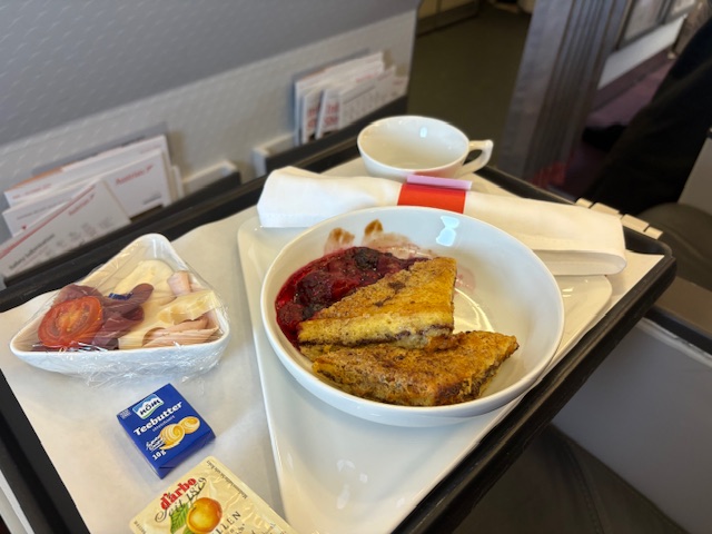 Das Catering von Do&Co wird bis heute noch in Porzellan serviert. Da Frühstückzeit kommt der French-Toast mit Kirschen warm und herzig daher. Etwas Aufschnitt und Käse mit Butter und Marmelade lässt die Kont-Freunde zufriedenstellen. Die favorisierten Getränke um diese Tageszeit sind Filterkaffee, Tee, Wasser und O-Saft.