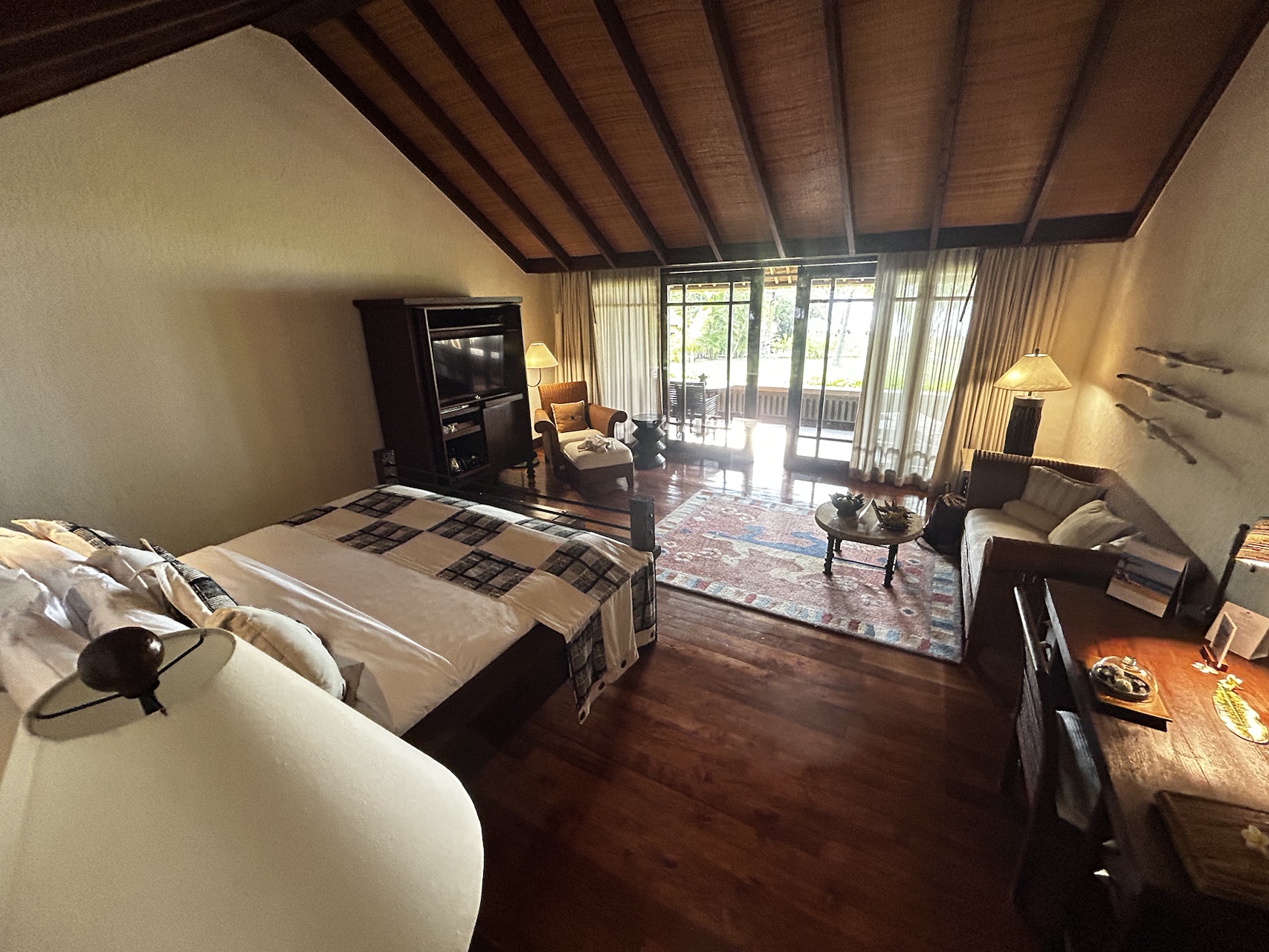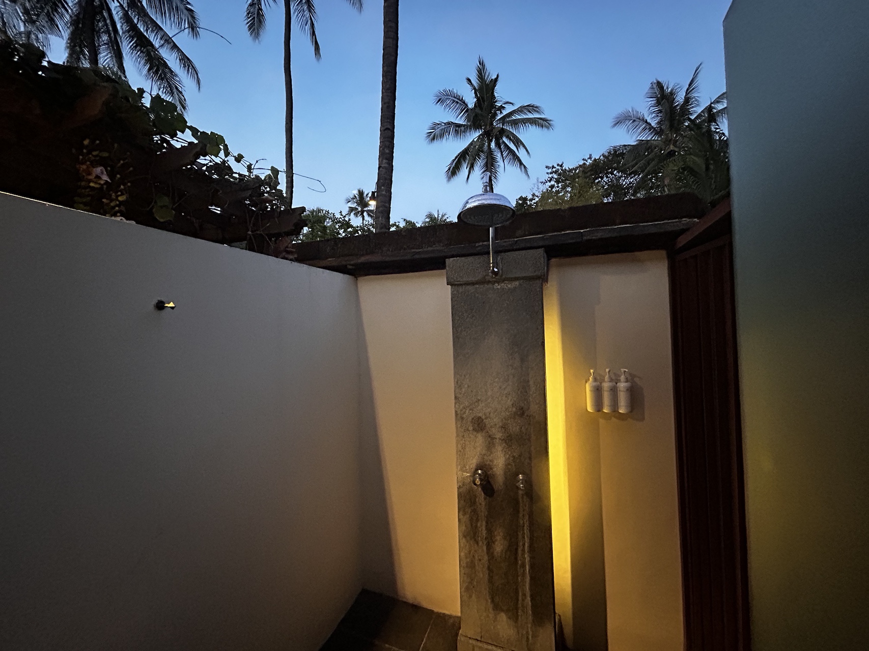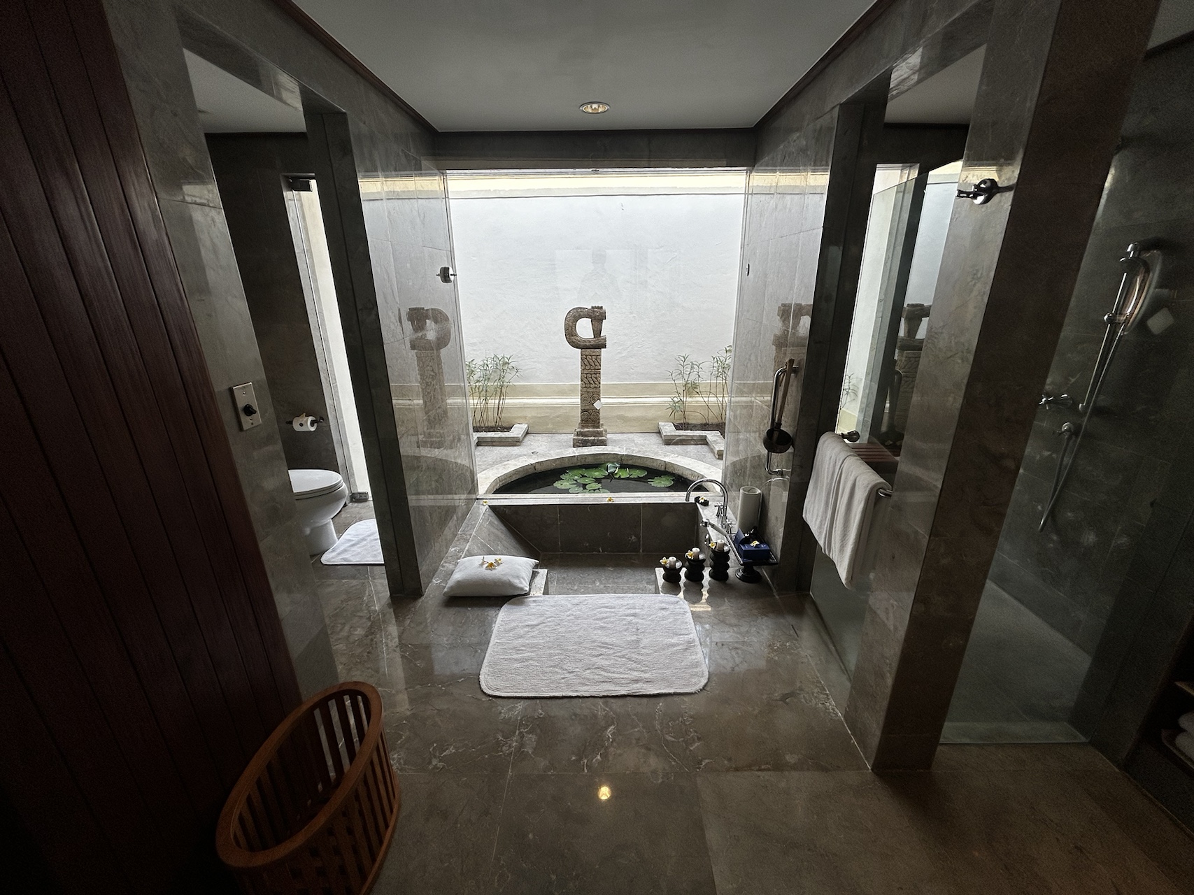 Die Oberoi Pavillions werden mit oder ohne Meerblick angeboten, sowie die etwas größeren Formate sind dann Villen ebenfalls mit Garten- oder Meerblick. Bei uns fällt die Wahl auf einen Pavillion mit Blick auf die See, inklusive Terrasse sind dies ungefähr 70 Quadrameter, also schön viel Platz der mit wertigen Hölzern der Insel gebaut wurde. Das Bad verfügt über eine 4 qm große Walkin Dusche, es gibt eine kleine Badewanne und 2 Waschbecken. Ebenfalls im Eintrittsbereich des Bads sind die Kleiderschränke sowie der Tresor anzufinden. Das 2,30 cm x 2,00 große Bett ist großzügig, eine Minibar, ein TV, ein Schreibtisch, alles was man im Urlaub so braucht-eher mehr! Die Terrasse ist obwohl Doppelzimmer mit nur mit einer Liege ausgestattet, einem Tisch mit 2 Stühlen und der Blick hinaus auf das Meer und die vorgelagerten Insel Gili-Air sind ein Traum. Die Klimaanlage ist genauso effektiv, nicht blasend nervig, fast schon elegant im Hintergrund und sie temperiert den Raum in Perfektion.