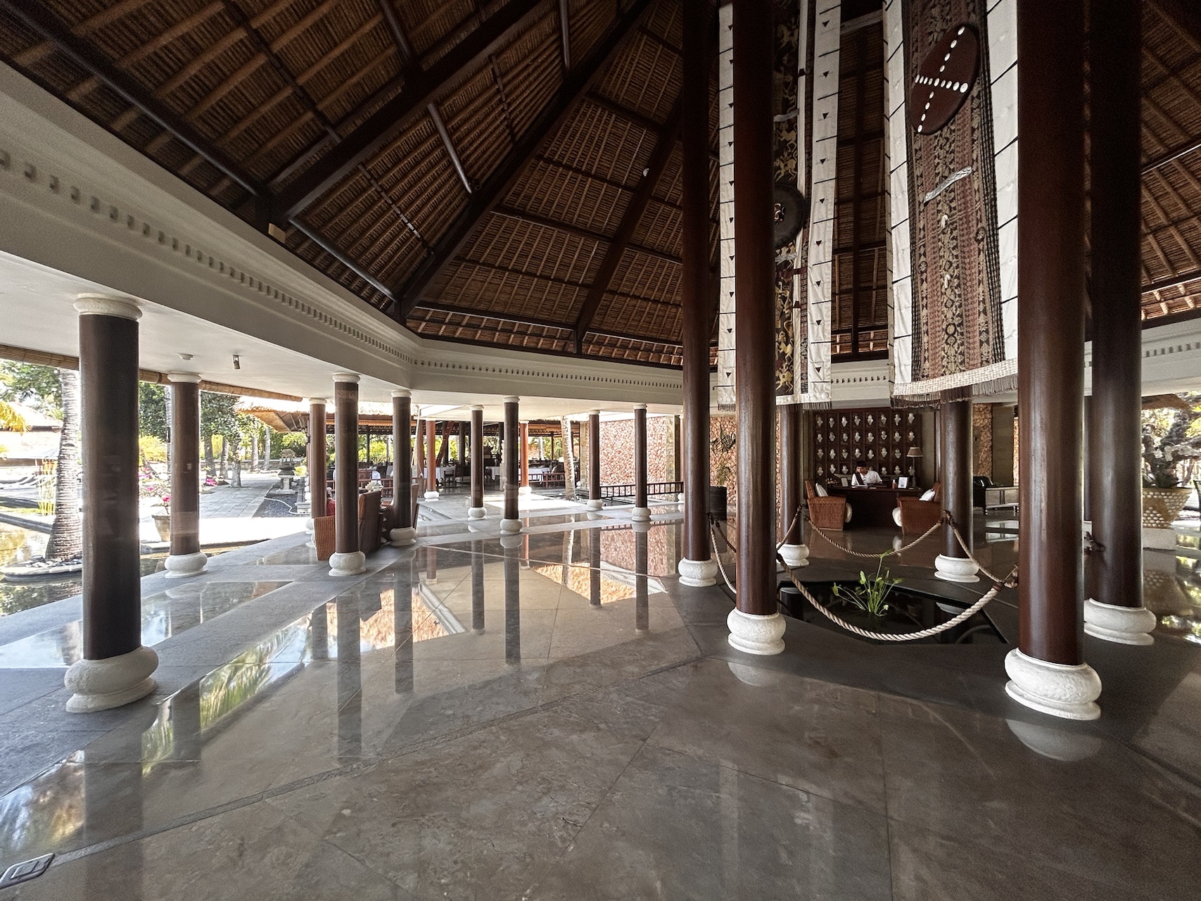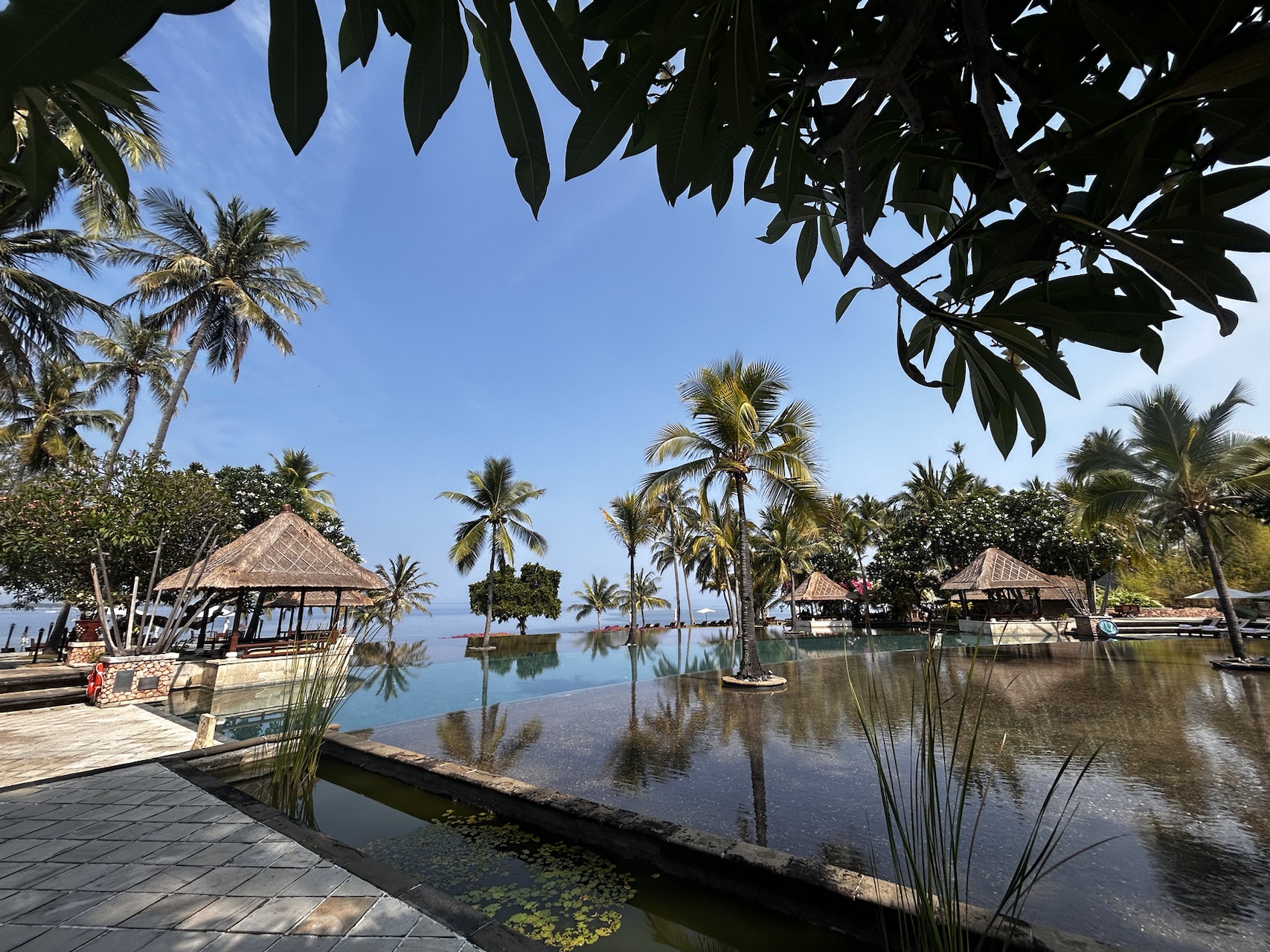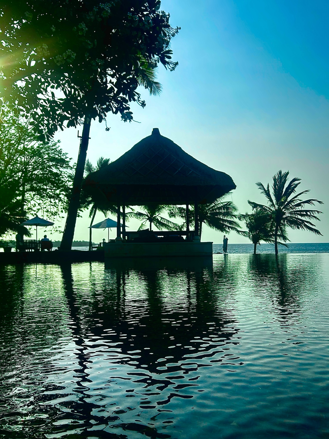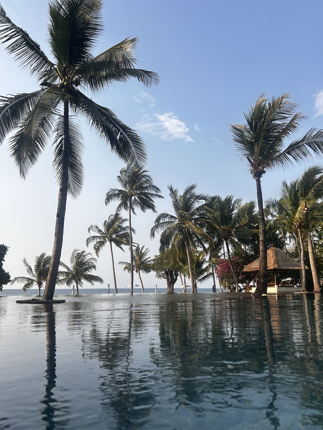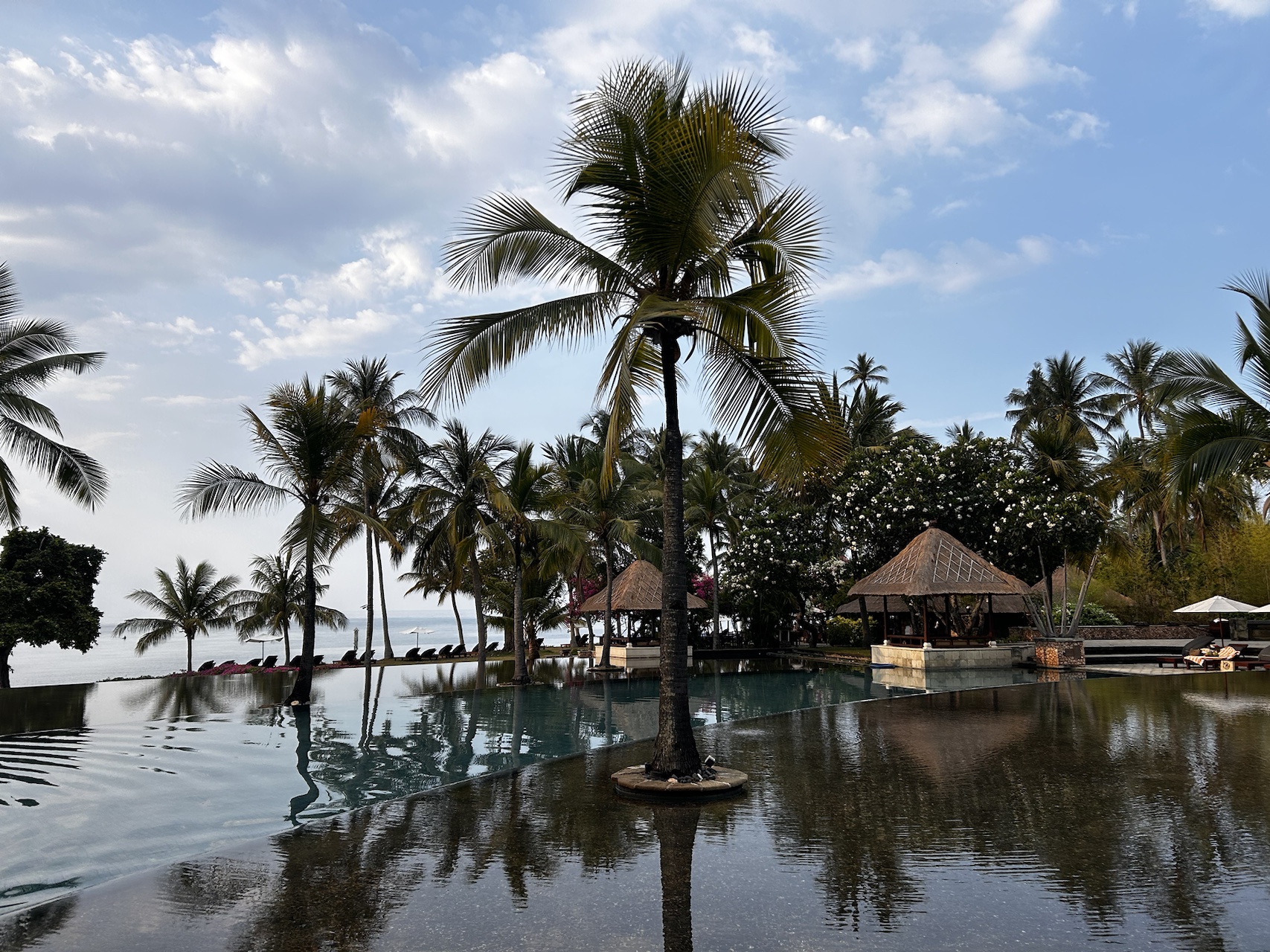 Von Bangsal dem Hafen in der Region, ist es mit dem Abholsvervice nur rund 10 Minuten bis zum Hotel. Der Empfang ist offen gestaltet, tropisch, geschlossene Räumlichkeiten sucht man erstmal vergeblich. Von hier aus hat man direkt einen schönen Blick über den großen Infinity-Pool, der in die See zu münden scheint. Palmen wedeln im sanften Wind der Insel, ein wunderbar schöner Eindruck welcher den Alltag vergessen lässt.