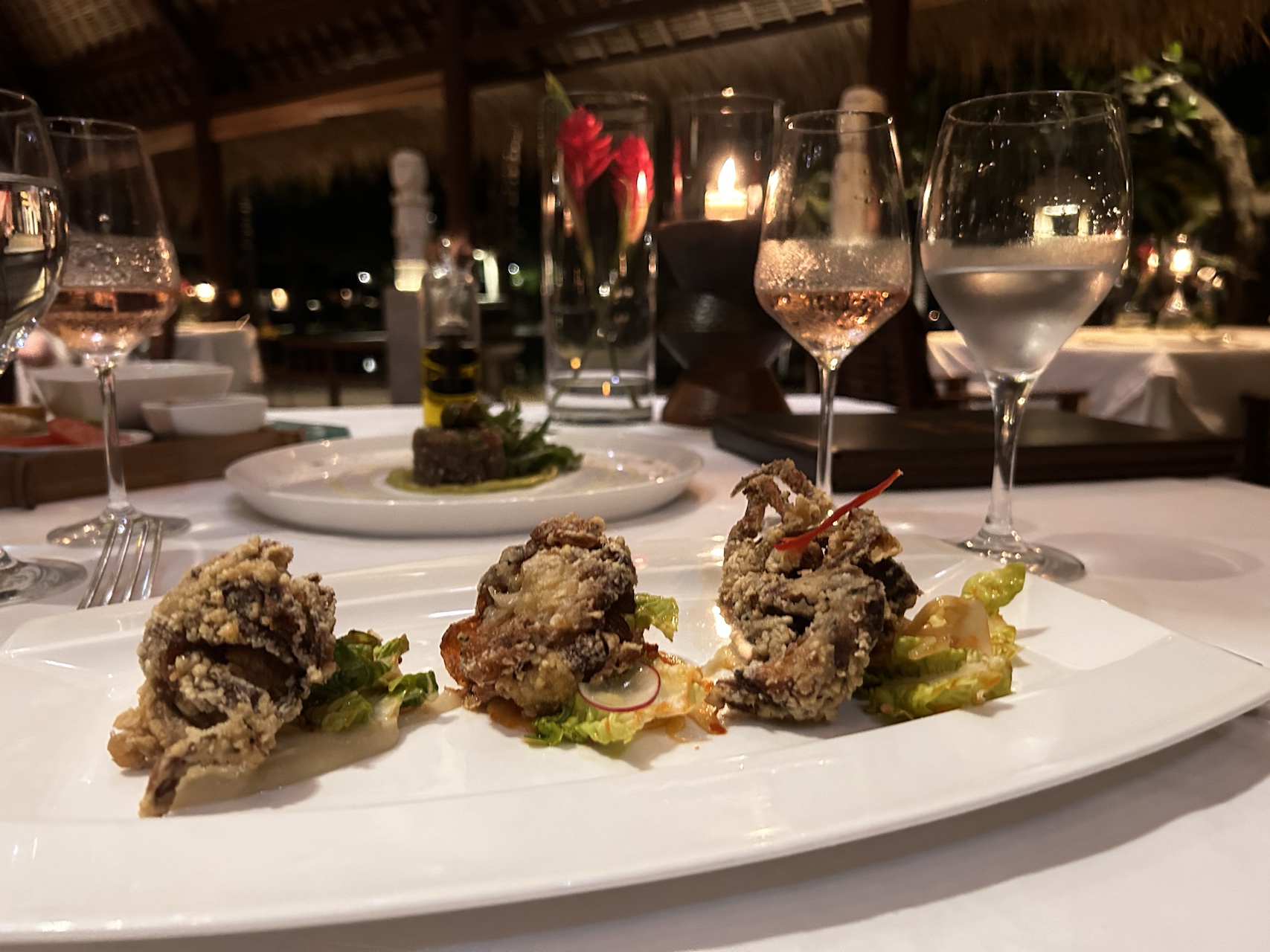 Bei den Vorspeisen kommt man in 8 Tagen nicht ohne das bekannte, gut schmeckende Thunfisch Tatar aus. Es wird recht europäisch serviert mit Kapern, Schnittlauch und einer Avocado Cream. Aus der indonesischen Küche mit ihrer Tradition für Seafood, gibt es einen marinierten, gekochter Fisch im Bananenblatt mit Wasserspinat. Der sogenannte „Pepes Ikan Lombok“ ist defintiv eine Versuchung wert. Dal Makhani wird zu meinem Favoriten, schwarze Linsen mit Knoblauch, Ingwer und Fenugreek ist ein fullminantes und schmackhaftes indisches Curry. Dazu wird Naan Brot, rote Zwiebel und Tomate sowie Reis gereicht. Maximaler Sättigungsgrad ist hierbei garantiert da der Küchenchef nicht am Ghee spart 🙂 . Wer geschmacklich und im Hauptgangbereich lieber in Europa bleibt, der bestellt ein Rinderfilet oder Hummer mit Bandnudeln in Tomatensoße. Unter Specials läuft das Gericht „Seafood Feast“, bei dem das feinste an Meeresfrüchten wie Calamari, Garnelen und ein ganzer Fisch, zum Beispiel an Barsch, vor dem Gast tranchiert wird. Für diejenigen die dann noch ein Platz im Bauch haben bieten sich diverse Desserts an oder auch eine Käseplatte.