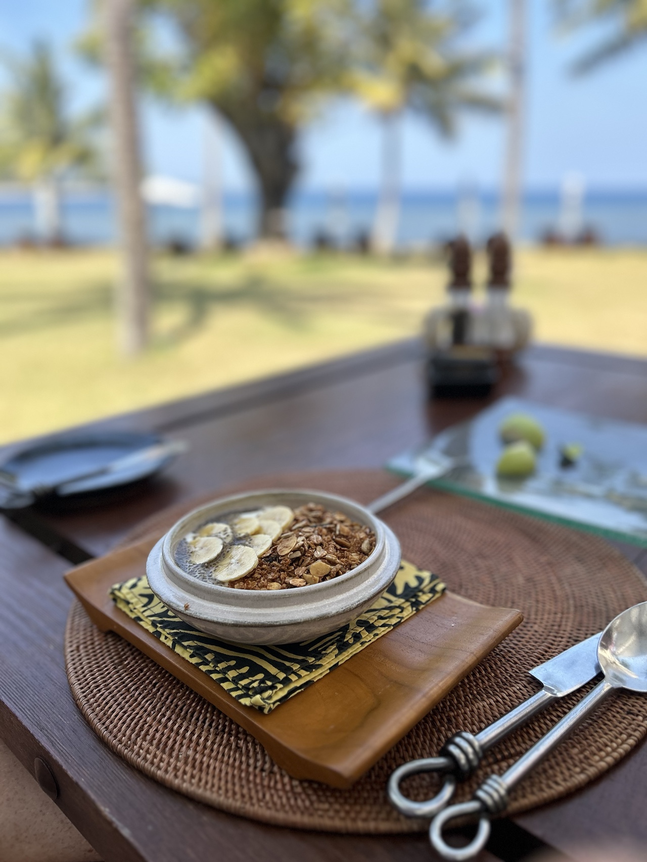 Säfte aller Art bespielen den Gaumen, indische Lassis, Kokonusswasser oder auch Smoothies. Weiter geht es im Programm mit Pfannkuchen, Bowls mit Chiasamen, sowie so richtigen Mahlzeiten aus Indien, wie dem Aloo Paratha, bei dem das Naan Brot mit pikanten Kartoffeln gefüllt wird. Selbstverständlich sind lokale Spezialitätenm wer möchte lässt sich schon um 10:00 Uhr auf ein Nasi Goreng ein oder Reisnudeln mit gekochten Hühnchen und Ei. In Summe hat die Frühstückskarte 4 Seiten und lässt somit gerade auch für Gäste die länger im Hause verweilen, keine Langeweile aufkommen.