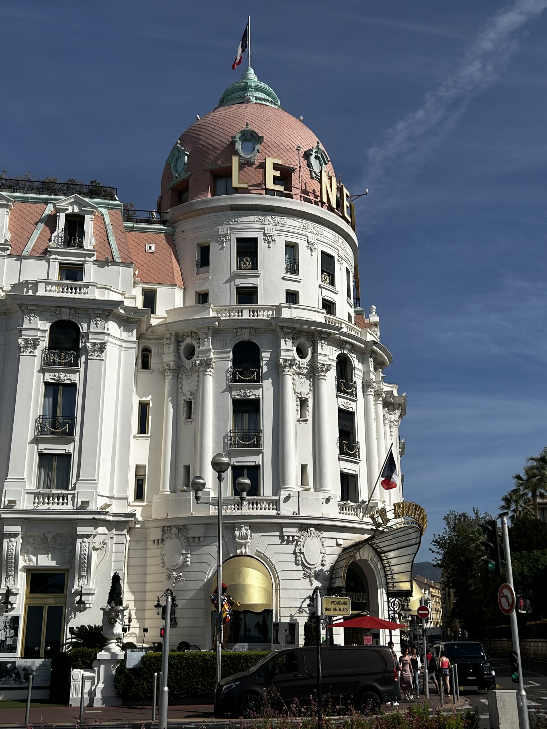 Mit der Eurowings geht es sehr früh von Düsseldorf per Direktflug nach Nizza. Die Economy Class ist das was es ist, im Vordergrund steht ein sicherer Transport. Vom Flughafen aus sind es 6 km per Taxi oder Bahn in die Innenstadt, wo das Hotel liegt. Der Versuch ein Zugticket am Automaten zu erwerben scheitert leider an der Warteschlange und am Bediener, sprich uns. Somit cruisen wir in einem fetten Elektro-Mercedes ganz im Style der Cote zum Hotel.