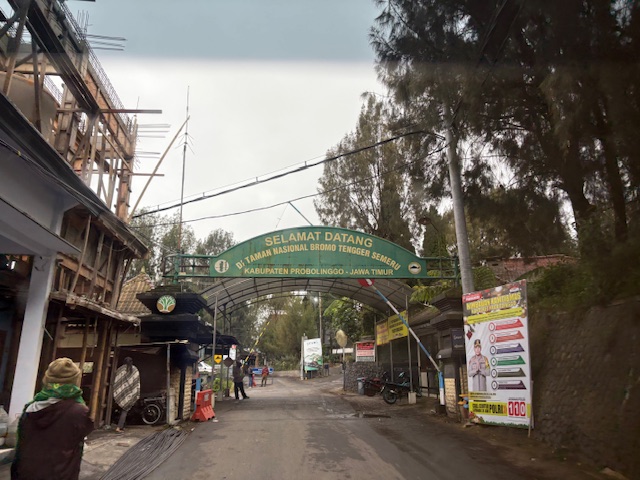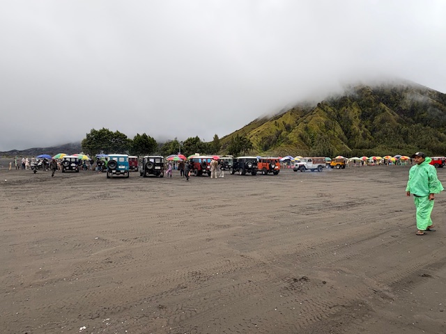 Es ist zugegeben Regenzeit und die Chance einen Traumtag im Park zu verleben ist somit gering! Für einen Sonnenaufgang muss der Besucher noch wesentlich früher aus dem Bett und da die Chancen darauf an diesem Tag gering sind, geht es erst kurz nach 4 in Richtung Süden. Die 2 stündige Fahrt erfolgt zu 30% über eine sehr freie Autobahn, im Anschluss wird es schon alleine durch den Regen, enge Straßen, aber auch wegen der Vegetation interessant. Der Park liegt in der Provinz Ost-Java auf der gleichnamigen Insel und besteht seit 1982. Der höchste Berg ist der mit 3676 Meter hohe Stratovulkan Semeru, welcher sich an diesem Tag leider hinter eine dicken Wand von Wolken versteckt. Ein richtig schöner Blick ergibt sich auf das Sandmeer innerhalb der Kaldera, welches einer Wüstenlandschaft ähnelt und nur mit einem Allrad Fahrzeug befahren wird.