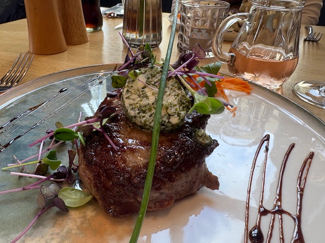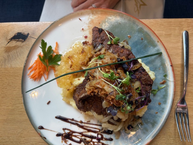 Heute findet sich auf der Karte das klassische Schnitzel vom Kalb, aber auch die Wildbratwurst schmeckt mit Salat und Kartoffelpüree. Ein sehr gutes Rumpsteak kommt mit Kräuterbutter perfekt gebraten auf den Teller, die Weinauswahl ist über jeden Zweifel erhaben. Wer Innerein mag der bestellt sich die zarte Rinderleber mit konfierten Zwiebeln und Schnittlauch.