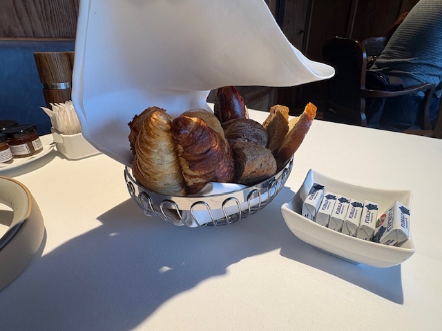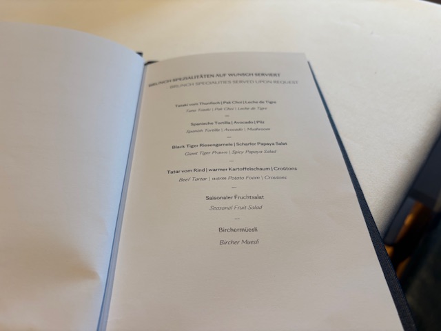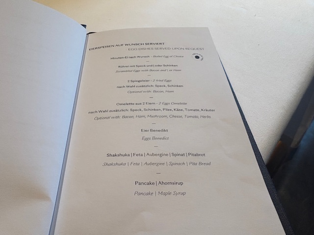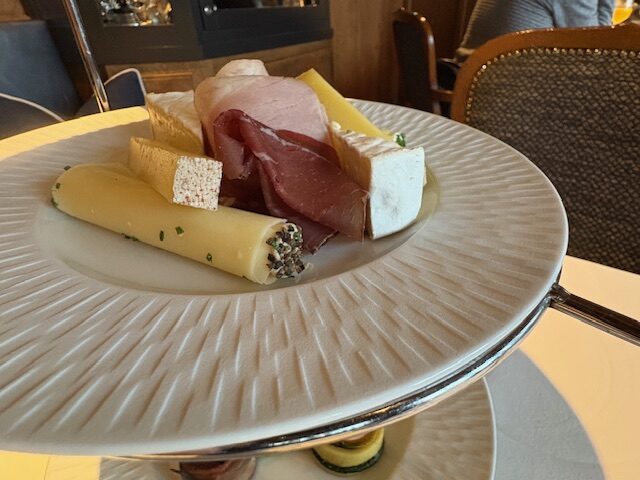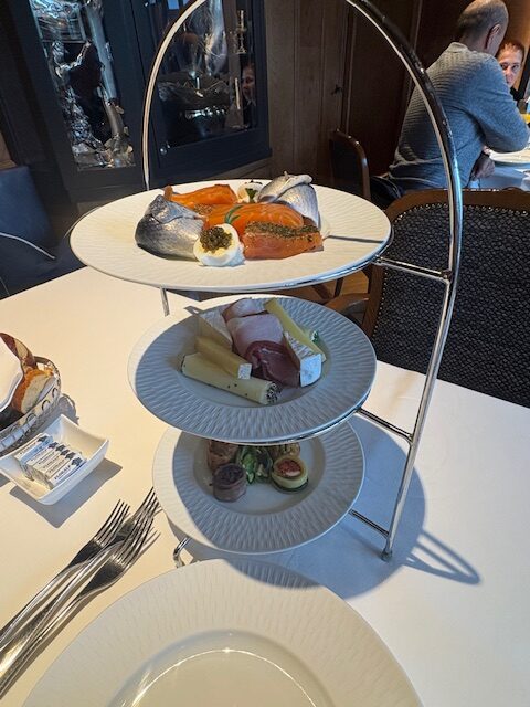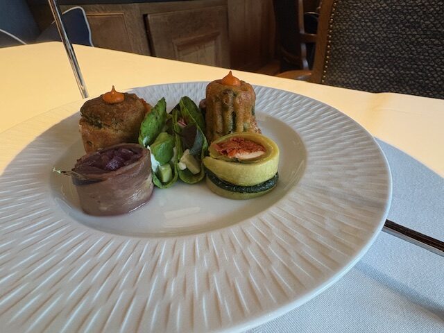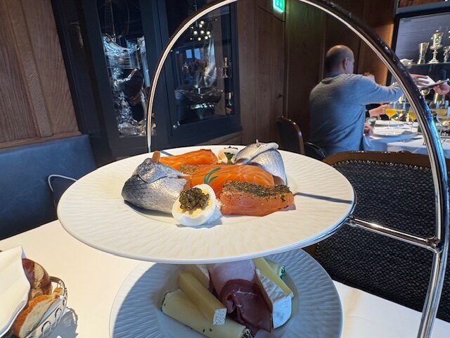 Der 2-Gang wartet mit 67 Franken auf, 3 Gänge kosten 80 und 4 Gänge 97 Franken. Sonntags wird immer ein Brunch serviert, wobei der Gast die Wahl zwischen Eierspeisen, leckeren Fischgerichten oder auch Pasta hat. Da der Besuch auf einen Sonntag fällt, startet die Experience mit einem Vitamin Booster auf Basis von kalt extrahierten Spinat. Auch der frisch gepresste Orangensaft mit einem reduzierten Anteil an Fruchtfleisch ist maximal lecker und stärkt das Immunsystem. Im Anschluss wird die Etagere gereicht, die auf 3 Ebenen unterschiedlich bestückt ist. „At the top“ ist eine kleine Fischselektion zu finden, Rollmops, geräucherter und gebeitzer Lachs als auch ein Wachtelei mit Kaviar, dass auf Meerrettich sitzt. Die 2 Lage ist mit leckeren schweizer Aufschnitt und Käse angerichtet, auch ein klassischer Bestandteil eines Brunches. Lage 3 gibt sich vegetarisch, Spinat-Feta-Mini-Muffins, Auberginenröllchen mit Zwiebelmarmelade oder ein mit Avocado und Radieschen gefüllter Crepe, alles in Summe sehr schmackhaft und ein Spiel der Texturen. Dazu gibt es einen Brotkorb und die gute schweizer Butter. Als Getränke sind unter anderem Kaffeespezilitäten, diverse Teesorten und eine halbe Flasche Champagner im Angebot inbegriffen. Der Service ist sehr zuvorkommend, ja hat einen Touch „Silver-Service“, während die Gäste das kredenzte bei einem kühlen Glas Perlwein mit Blick auf den Fluss die Limmat, schweifen lassen.