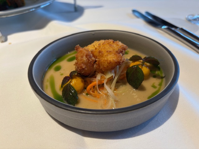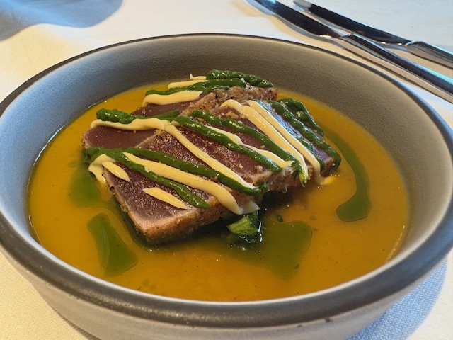 Nach einer ersten Runde des sättigens, folgt der a la carte Teil. Auftakt macht, da kein Eierspeisen Fan, ein leckeres Tataki vom Thunfisch mit Pak Choi und Leche de Tigre. Auch hier verschmelzen kulinarische Ansätze aus Japan und Peru, die Tigermilch ist ein Rezept auf Basis von Limettensaft, gecrunchten Eiswürfeln, Ingwer und durchaus einem Touch Chili.