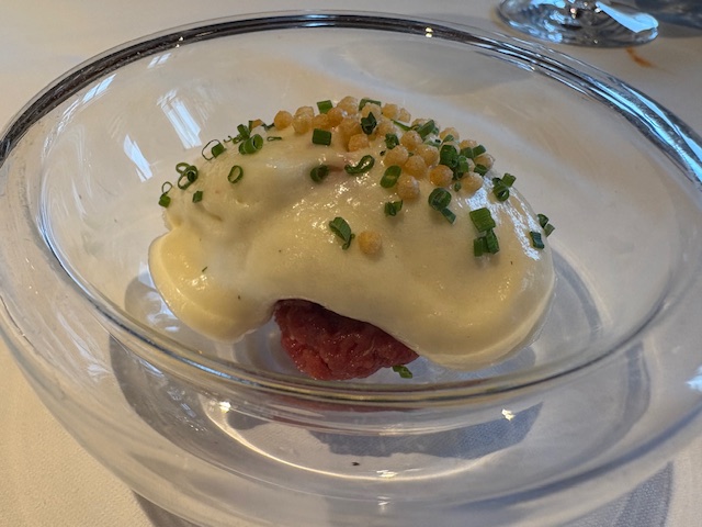 Nach einer kleinen Pause ist noch ein wenig Platz für feinkörnig geschnittenes Rindertartar mit Kartoffelschaum, welches eine Rezeptur aus dem Siphonspender ist. Das pelzige der Kartoffel ummantelt sehr schön das marinierte Rindfleisch, klein geschnittene Croutons geben ein wenig Textur- und Crunchspiel dem Gang.