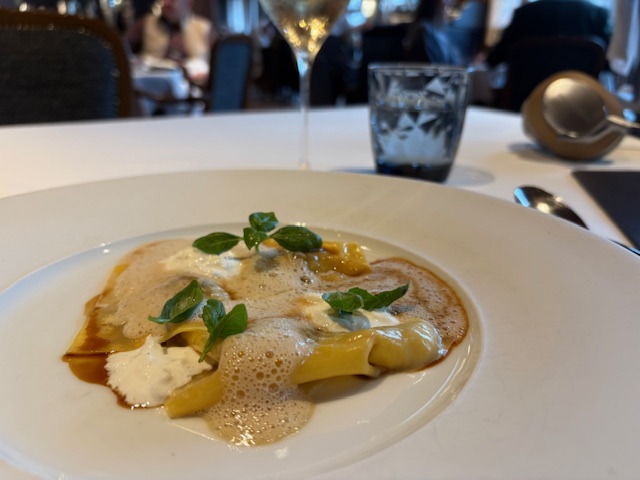 Obwohl die Karte wahrhaftig noch viele weitere Gänge anbietet, fällt die letzte Wahl auf den Ravioli vom Schweizer Wagyum Burrata, Basilikum und Kartoffelknusper, eine gelungene Komposition, welche viel Umami, eine al dente Pasta bietet und auch optisch überzeugt.