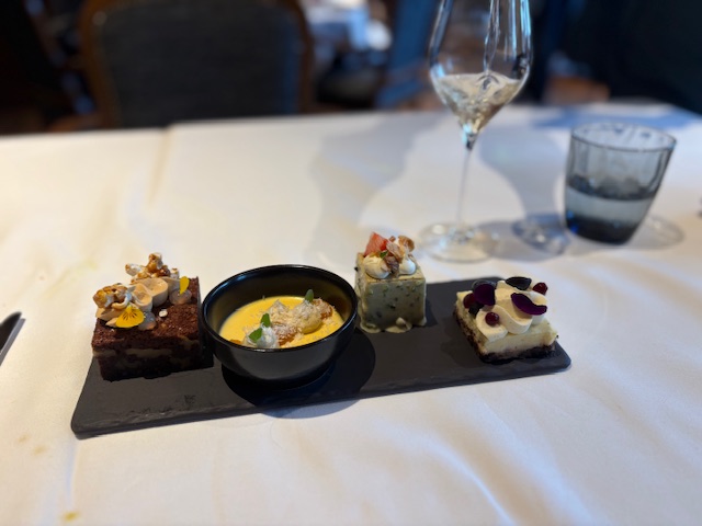 Die Dessertauswahl ist final auch auf ausgeprochen hohen Niveau, auch wenn der Custard die Vanilleschoten optisch vermissen lässt. Der Brownie ist „so rich“ schokoladig und on top sehr fein mit Popkorn und Blüten garniert. Die Erbeerpraline mit weißer Schokolade ist geschmacklich mein Dessert-Favorit, viel Textur, viel Kremigkeit und Karamell, verschaffen jedem Gast ein schlechtes kalorisches Gewissen. Der kleine Käsekuchen mit Blaubeere ist definitiv auch eine Sünde wert, wenn man einmal davor sitzt ist Flucht keine Option!