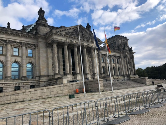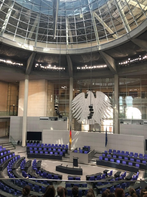 24h später stehen wir vor dem Bundestag und weitere Minuten später auf den Besucherrängen, von denen wir leider keine Sitzung zu sehen und hören bekommen, da sitzungsfreie Woche ist, schade! Auch die Kuppel bleibt unbesichtigt, obwohl die angekündigte Putzkolonne nicht in Erscheinung trat. Trotzdem ein tolles Erlebnis, das sicherlich in Erinnerung bleibt.