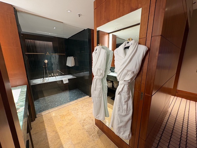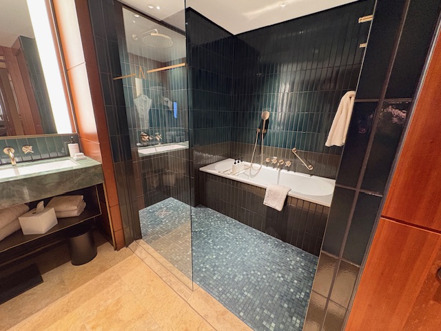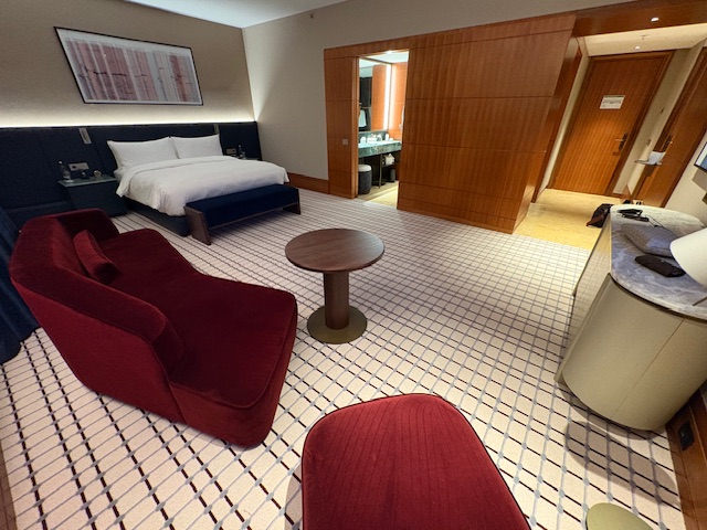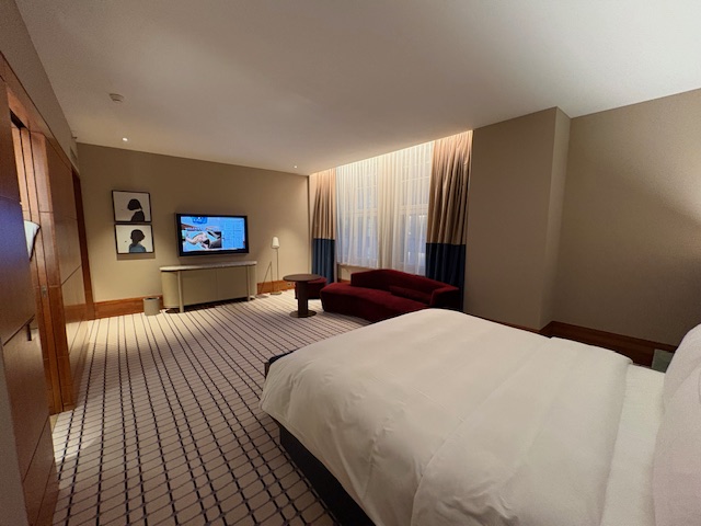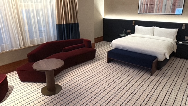 Der gebuchte King Premier Room mit angegebenen 40 Quadratmetern, einem Sofa, Kaffeemaschine, Regendusche wird mit 280 Euro pro Nacht als Direktzahlung verkauft. Durch die Platinium Kreditkarte und dem damit verbundenen Gold Status der Hilton Gruppe, ist man bei Verfügbarkeit stets eingeladen ein Zimmerupgrade in Anspruch zu nehmen. Somit wird es das 50 Quadratmeter große King Executive Zimmer, welches noch mehr Platz bietet. Die Betten sind mit hochwertigen Decken und Kissen ausgestattet, die Nespresso Maschine bietet den ersten Kaffee des Tages, die Minibar lädt am Abend vorher zu einem Absacker ein, auch wenn die Preise gesalzen sind. Ebenfalls sehr angenehm zu tragen ist der aus 100 % Baumolle bestehende Bademantel. Die Pflegeprodukte von Shampoo, Conditioner und der Lotion runden den Wohlfühlmoment in diesem hochwertigen und renovierten Zimmer ab.
