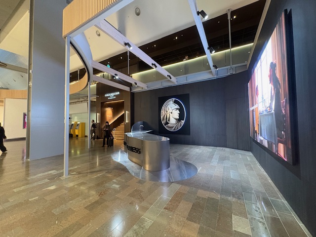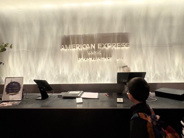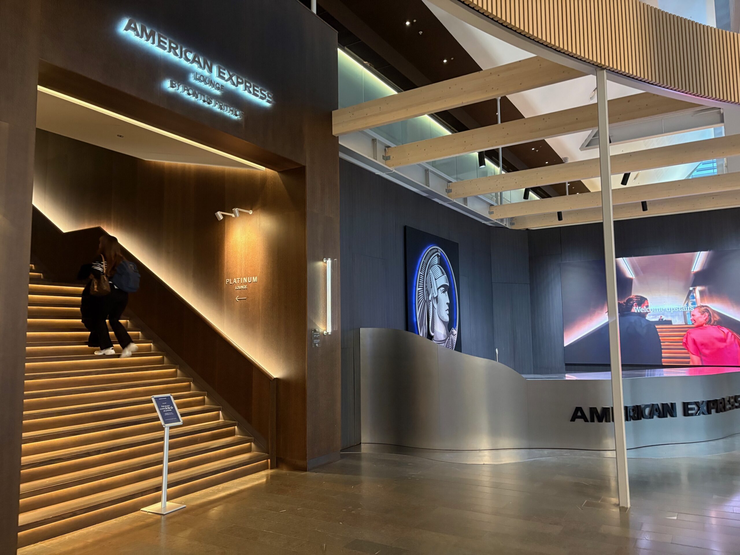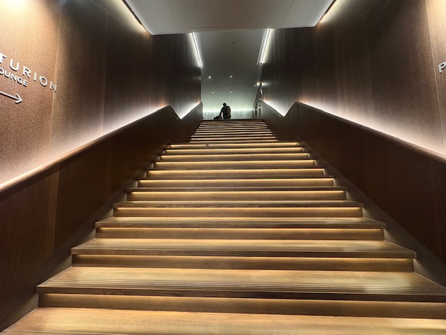 Zuerst geht es eine imposante, breite Treppe zum Empfang hinauf, wo kontrolliert wird ob man Zugang hat. Voraussetzung ist eine Platin Kreditkarte aus gleichnamigen Hause.
