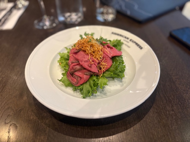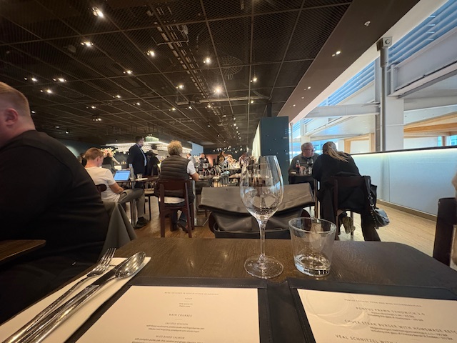 …ist durchaus attraktiv! Es unterscheidet sich, dass es eine Version ohne Zuzahlung gibt und eine weitere die einen Aufschlag erhebt. Neben Snacks wie Nüssen, Chips oder auch Keksen, liegt der heutige Fokus auf dem Roastbeef Sandwich mit dänischer Remoulade und knusprigen Sellerie. Dazu passt hervorragend ein Riesling vom Kloster Eberberg aus dem Jahr 2023. Bei der zweiten Bestellung fällt die Wahl auf das Wild mit Preiselbeeren. Die fein geschnittenen „Blättchen“ in Sauce vom Hirsch mit Preiselbeeren sind sehr schmackhaft, auf das Pilz-Kartoffelstampf wurde verzichtet. Der sehr gute trocken ausgebaute Syrah aus Frankreich ist die perfekte Ergänzung. Das prickelnde und gut gekühlte Mineralwasser aus der Karaffe ist für eine zwischenzeitliche geschmackliche Neutralisierung eine Erfrischung. Wer sich in Sachen Drinks noch austoben möchte der bestellt den Cuba Libre oder einen Aperol Spritz.