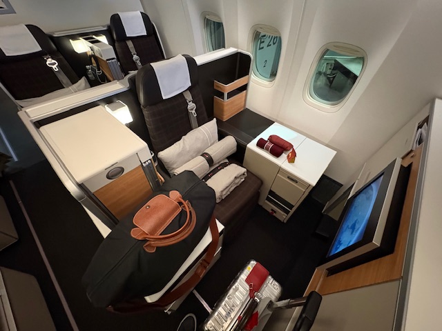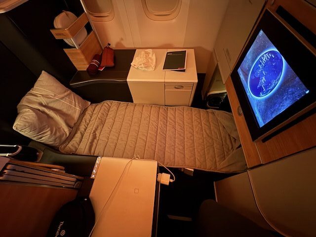 Bei der aktuellen Einteilung der Business sind die Reihen 4 und 5 zu bevorzugen, da es in diesem Compartment nur 10 Sitze sind und es deutlich ruhiger zugeht als im großen Abteil mit stolzen 52 Gästen. Da wir früh an Bord sind, gibt es ausreichend Zeit um noch ein paar Bilder der leeren Kabine zu machen. Am Sitz findet man zudem eine Decke, ein Kopfkissen, den Amenity Kid und eine Art dünne Matraze vor, welches zusammen den Flug doch deutlich angenehmer machen wird. In diesem Throne Seat gibt es gute Ablagemöglichkeiten, dass Fussfach ist durch den sogenannten „Bulkhead“ nochmal besonders breit und bietet entsprechend viel Platz. Für die Unterhaltung sorgt das Entertainment System mit Musik und aktuellen Hollywood Kinofilmen. Die Noise-Cancelling Headphones sorgen für einen guten Sound, auch wenn man aktuell, aber dafür in Zukunft, noch nicht seine eigenen Kopfhörer anschließen kann. Ebenfalls findet sich am Platz die Getränke- und Speisekarte.