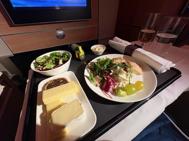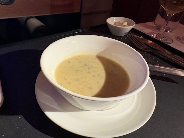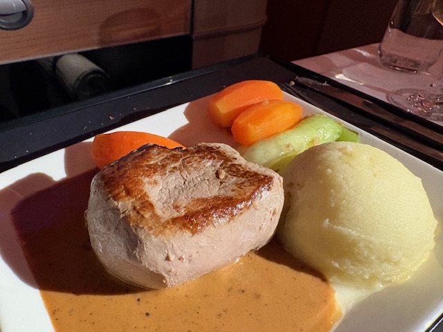 Bevor der Hauptgang aufgetischt wird, erwärmt die Kartoffel-Lauch-Cremesuppe die Seele. Bei der Auswahl für das Gericht, wählt der Business Class Passagier zwischen Kalbsfilet mit Pfeffersoße, pochierten Saiblingsfilets mit Zitronengrassoße und gebackener Süßkartoffel mit Chimichurri und roten Quinoa. Auch wenn das Kalbsfilet wie in den 80er Jahren angerichtet wurde, mit tournierten Karotten, einem Kartoffelstampf aus dem Eisportionierer, schmeckt es wirklich lecker und ist vermutlich aus Versehen untergart, ja sogar bleu. Im Flugzeug ist normalerweise alles schrecklich „totgegart“, ich feier diesen Garpunkt, der bei anderen Gästen wenig Freude hervorruft.