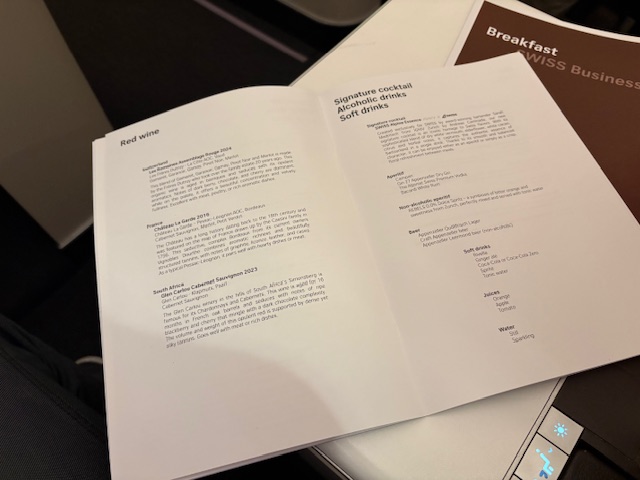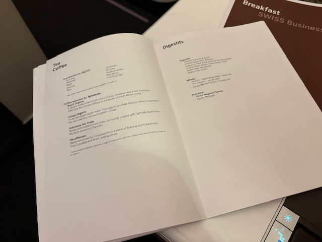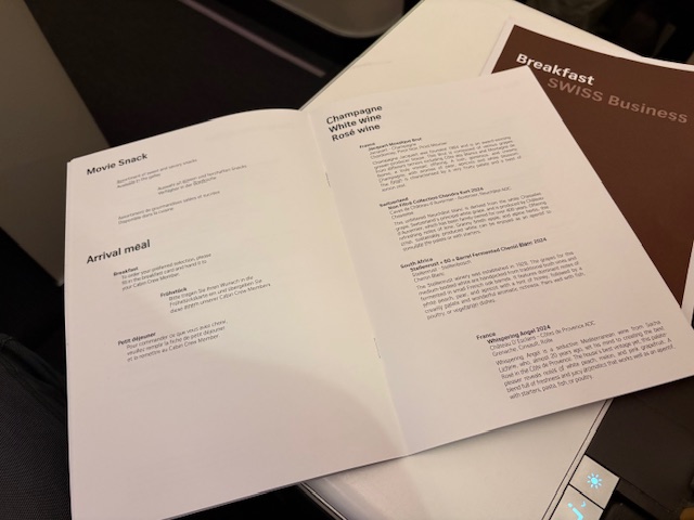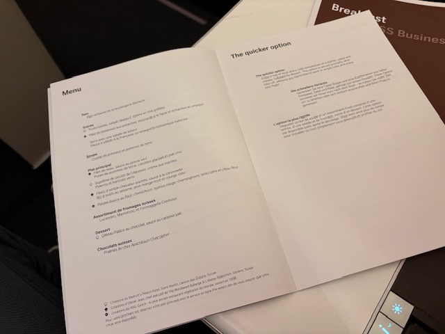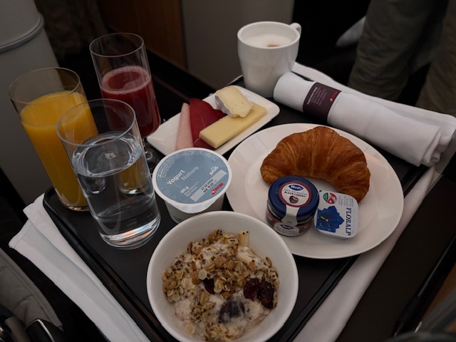 Nach 6 Stunden Schlaf auf diesem 12 Stunden Flug serviert die Swiss und Ihre gute Crew ein Frühstück, bestehend aus Bircher Müsli, einem Croissant, guten Lavazza Milchkaffee, etwas Käse und Bündner Fleisch. Eierspeisen werden ebenfalls angeboten und können schon vor der Bettruhe auf einer Vorbestellkarte gekennzeichnet werden.