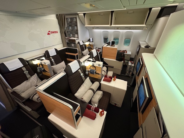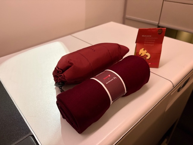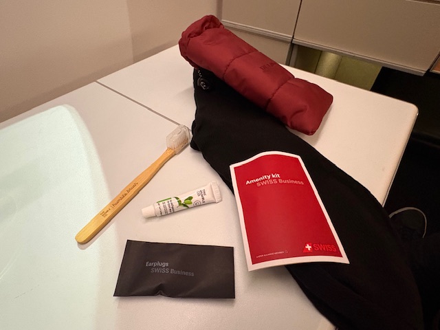 Am Platz angekommen findet man neben einer Wasserflasche auch ein Reiseset für mehr Komfort. Neben einer Zahnbürste, eine Creme für die Lippen, die Hände als auch das Gesicht, beinhaltet dieses Set noch Socken und die Augenmaske fragt man beim Personal an. Vom Prinzip fliege ich gerne mit Swiss, da man schon das Gefühl der Schweiz sehr gut vermittelt bekommt. Mit der neuen Business Class Bestuhlung die in den nächsten Jahren Einzug halten wird, kann man sich auch auf mehr Privatsphäre freuen, die aktuell nicht sehr ausgeprägt ist.