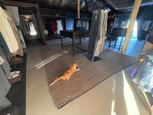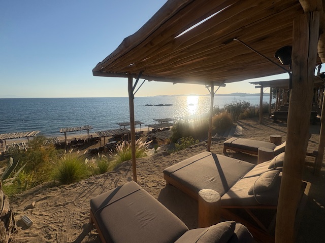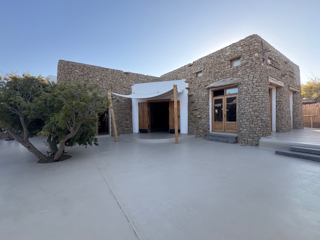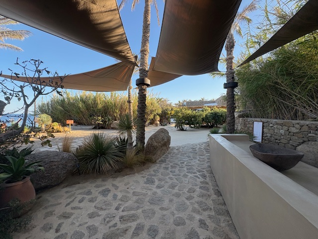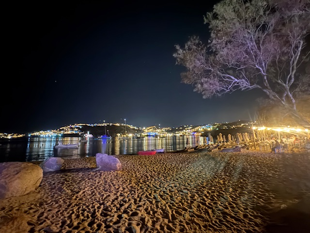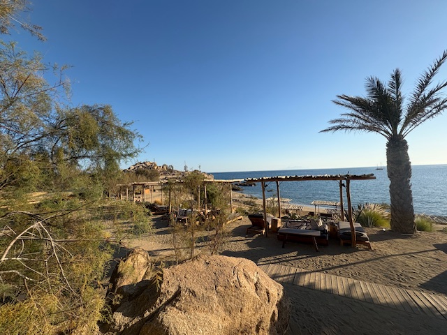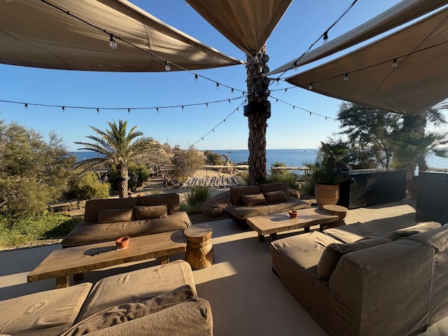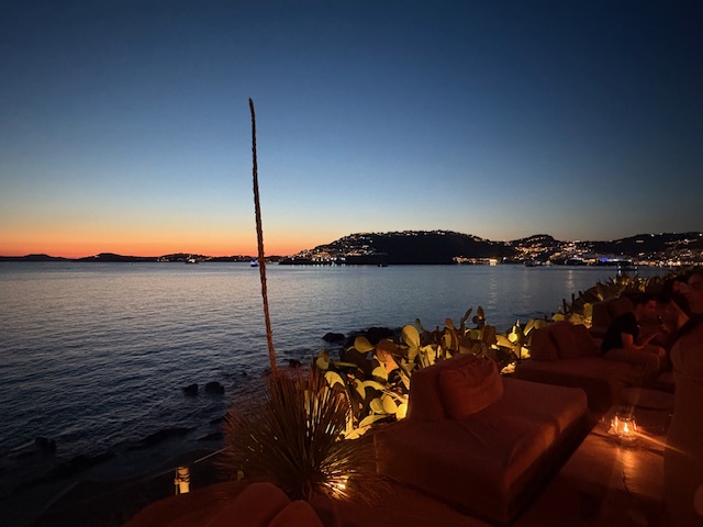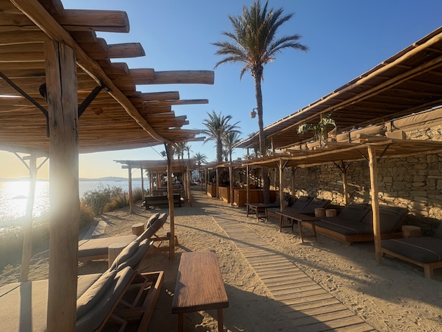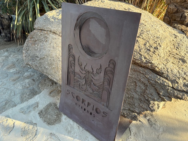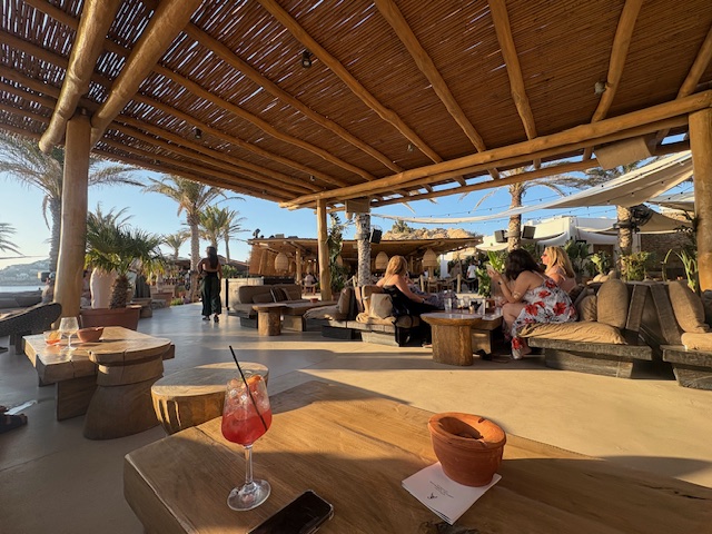 Vom Hotel Myconian Ambassador sind es 15 Minuten Fussweg oder die meisten Gäste lassen sich fahren, kommen mit dem Auto und finden einen Valet Parking Service vor. Danach erfolgt wie in einem Hotel der Check-in an der Rezeption, ob eine Reservierung vorliegt. Der erste Eindruck ist definitiv beeindruckend, die Einrichtung verspricht nicht nur einiges auf ihrer Homepage, sondern liefert auch. Alles ist Ton in Ton in den Felsenfarben der Halbinsel gehalten, Holz und arabische Stoffe reflektieren die Wärme der Sonne auch zu später Stund. Im Eingangsbereich sind in Zelten auch Boutiquen eingerichtet, für den letzten „heißen Scheiss“, wenn es um Kleidung geht. Danach folgt eine coole 360 Grad große Bar, wo es ein sehr umfängliches Menu and Drinks und Snacks gibt. Müssig zu erwähnen das man für die teuerste Flasche Wein, eine 6 Liter Dom Perignon Rose 26.000 Euro hinblättern muss. Es geht auch günstiger, eine Flasche Wasser bekommt der Gast für 10 , ein Cocktail für 23 Euro. Der Scorpios Spritz ist eine Anlehnung an den Aperol, der hier auch auf Nachfrage nicht serviert wird.