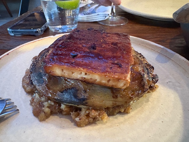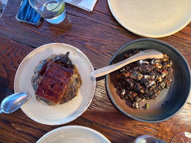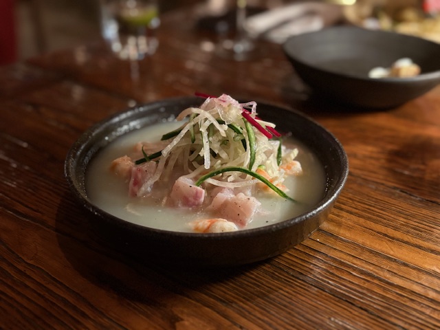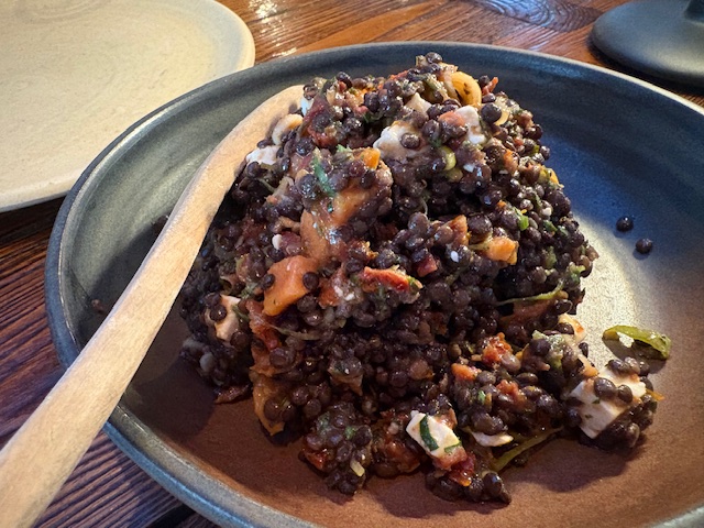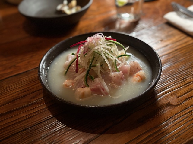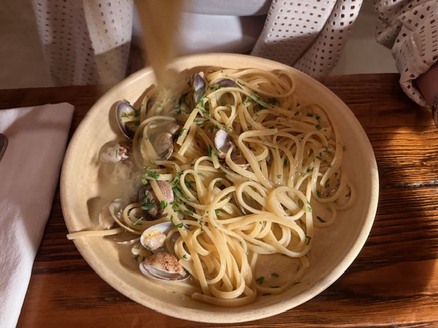Im Restaurant ist man in jeder Kategorie top! Der Service ist nicht im Ansatz „understaffed“, die Tische werden mehrmals im Verlauf des Abends abgewischt, die Wassergläser bleiben nicht leer und die Essensbestellung wird zügig aufgenommen. Vorspeisen kosten hier zwischen 20 und 60 Euro, Hauptgänge beginnen bei 50 und haben eine gewisse Luft nach oben, wenn es um die Euros geht. Die erste Wahl fällt auf einen super leckeren Beluga-Süßkartoffel und Fetasalat mit sonnengetrockneten Tomaten. Die langsam gebackene Aubergine wird ebenfalls mit dem griechischen Käse kombiniert, ist langsam geröstet und in Kombination mit dem Honig sowie Brazil Nüssen extrem lecker und Textur versiert. Das Hauptgang Angebot ist kulinarisch und aus Menu Management Perspektive vielfältig. Egal ob Free-Range-Chicken (48/96), das US Grain Fed Sirloin mit gegrillter Paprika (88), über klassische Pasta Gerichte (29), lassen wenig Wünsche offen. Doch wie schmeckt es? Die Linguini a la vongole sind so Umami intensiv, al dente gekocht und zum Reinsetzen! Einfach aber gut gekocht! Das Spicy Ceviche vom Barsch und der Garnele kommt mit reichlich Rohkost als Garnitur in einer Zitruslacke, ist erfrischend und recht grob geschnitten, aber lecker.