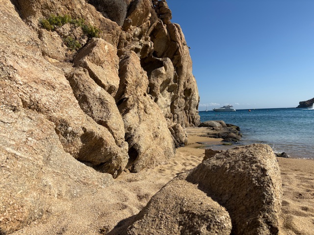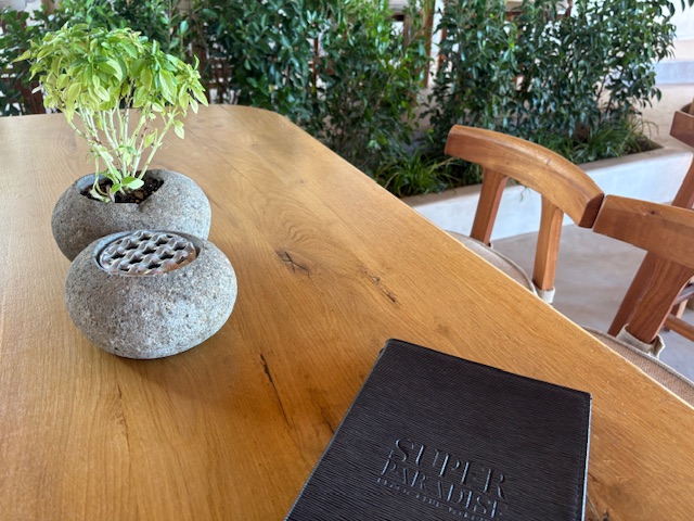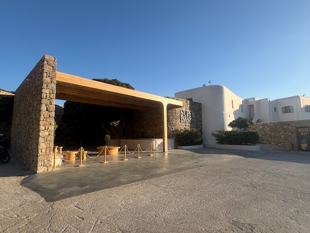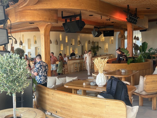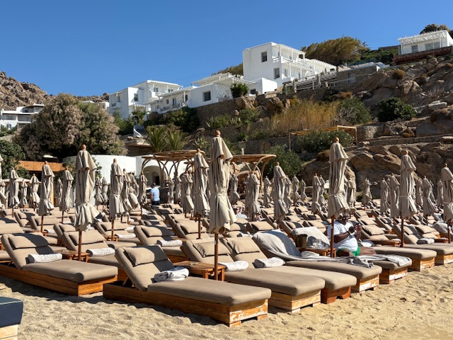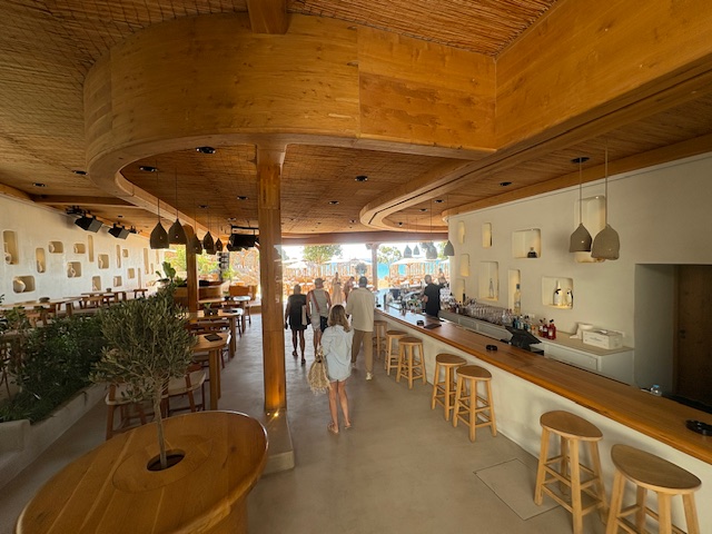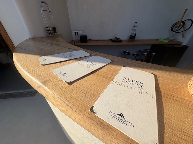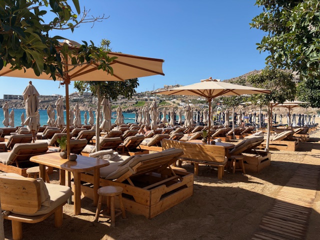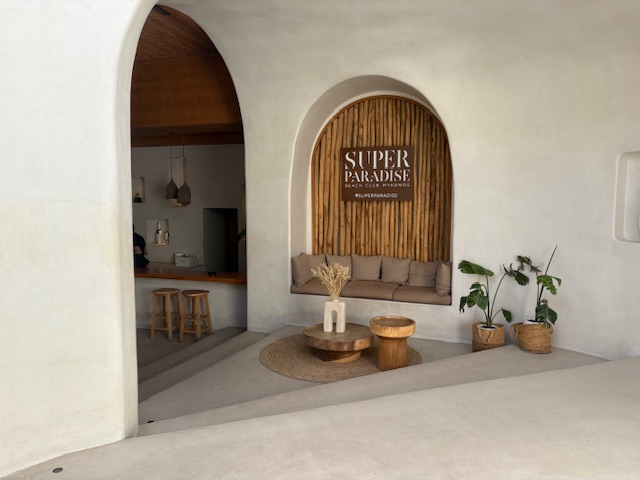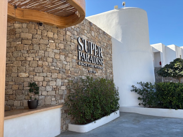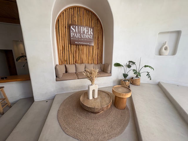 Beachclub Nummer 1 ist der Super Paradise im südlichen Teil der Insel. Erreichen tut man diesen mit einem Mietwagen, entlang der kurvigen und auch manchmal engen Straßen der Insel. Aus anderen Teilen der Insel lässt sich auch eine Personenfähre nehmen um diesen recht isolierten Ort zu erreichen. In unserem Fall empfängt einen der Mitarbeiter vom Valet Parking als erstes. Um 11:00 Uhr ist der Club noch recht übersichtliche gefüllt, was sehr angenehm ist. Die Liege in der ersten Reihe kostet inklusive Handtuch 50 Euro, pro Person! Das inkludiert einen guten Ausblick auf den sehr guten Strand mit dem Mittelmeer zu seinen Füßen. Man wird direkt an der Liege auch bedient, die Speisekarte lädt man via QR Code auf sein Handy. Die Auswahl ist sehr gut, sehr umfangreich und der Service weitesgehend aufmerksam. Von Sushi über Hamburger, Sandwiches, Steaks bietet man hier eine große Bandbreite, die der Gast direkt in seiner Liege oder im Restaurant Bereich konsumiert.