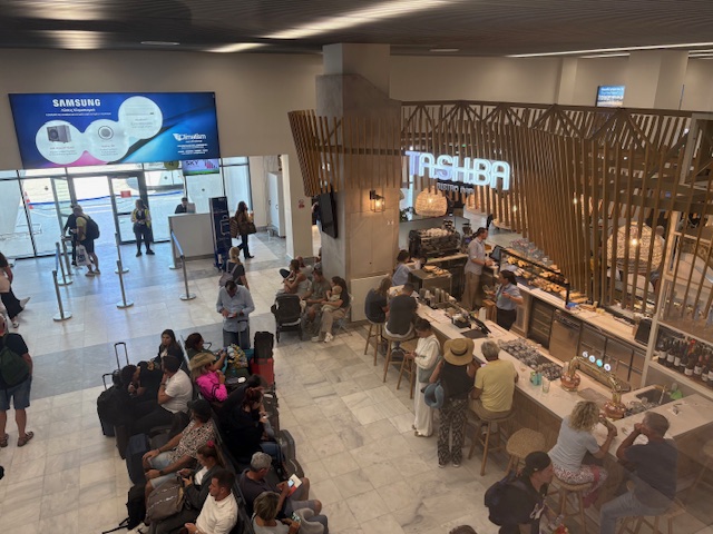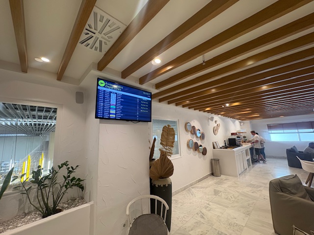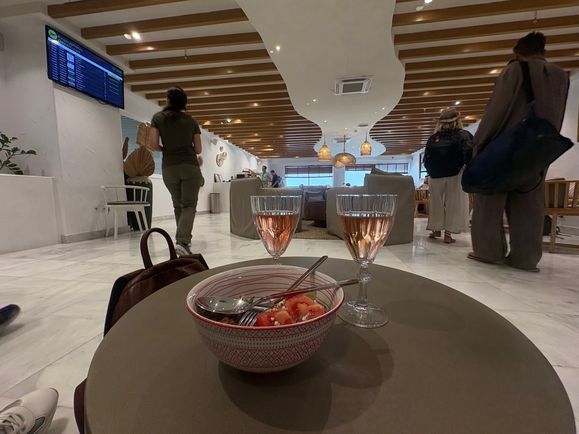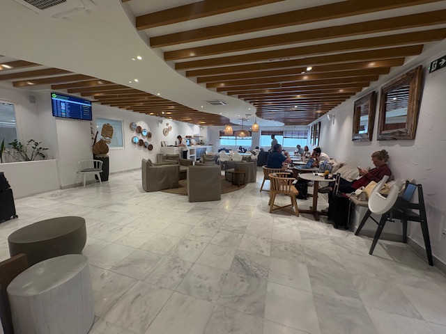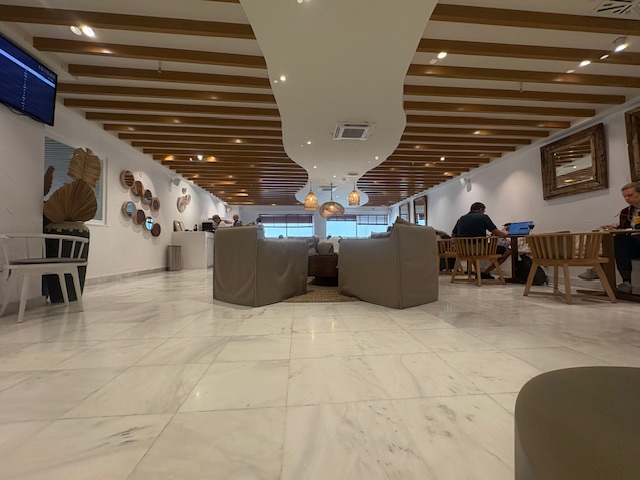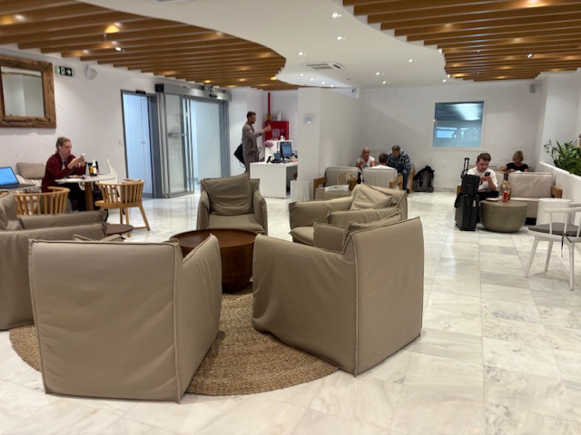 Am beschaulichen Flughafen von Mykonos gibt es eine Departure Lounge. Zugang erhält man unter anderem mit dem Priority Pass. Das Design passt sich auf jeden Fall dem der Insel an. In weiss gehalten mit hölzernen Elementen und entspannten Sitzmöglichkeiten ist die Einrichtung optisch schon einmal gelungen. Es gibt ungefähr 50 Sitzplätze was zu Spitzenzeiten schon einmal eng werden kann.