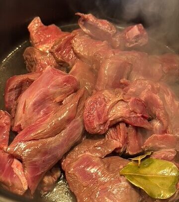 Das Fleisch gut abtropfen lassen, den Rotwein zum Kochen verwenden.