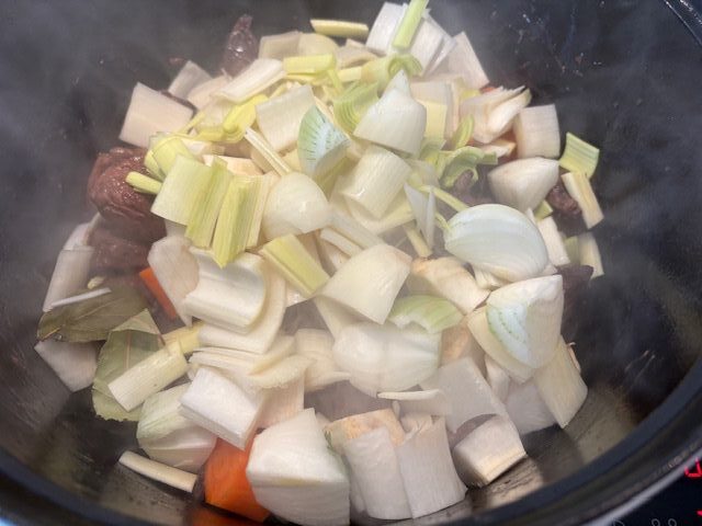 Bei einer Sauce Chasseur (Jägersoße) interpretiere ich das Finale ein wenig anders, der Ansatz mit dem Wurzelgemüse wird zum Ende hin püriert, die Pilze werden extra in einer Pfanne gebraten und später über das Gericht gegeben. Die hebt die Wertigkeit, da neben dem Fleisch die Pilze eine schöne Abwechslung beim Genuss bieten, sprich Textur und Aroma. Desweiteren verzichtet dieses Rezept auf Mehl und bindet nur durch den Püree Vorgang zum Ende hin die Sauce.