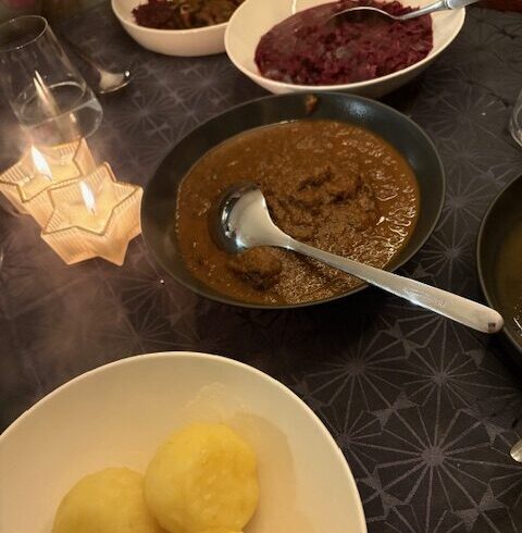 Dazu passt hervorragend ein Rotkraut und der klassische Kartoffelknödel.