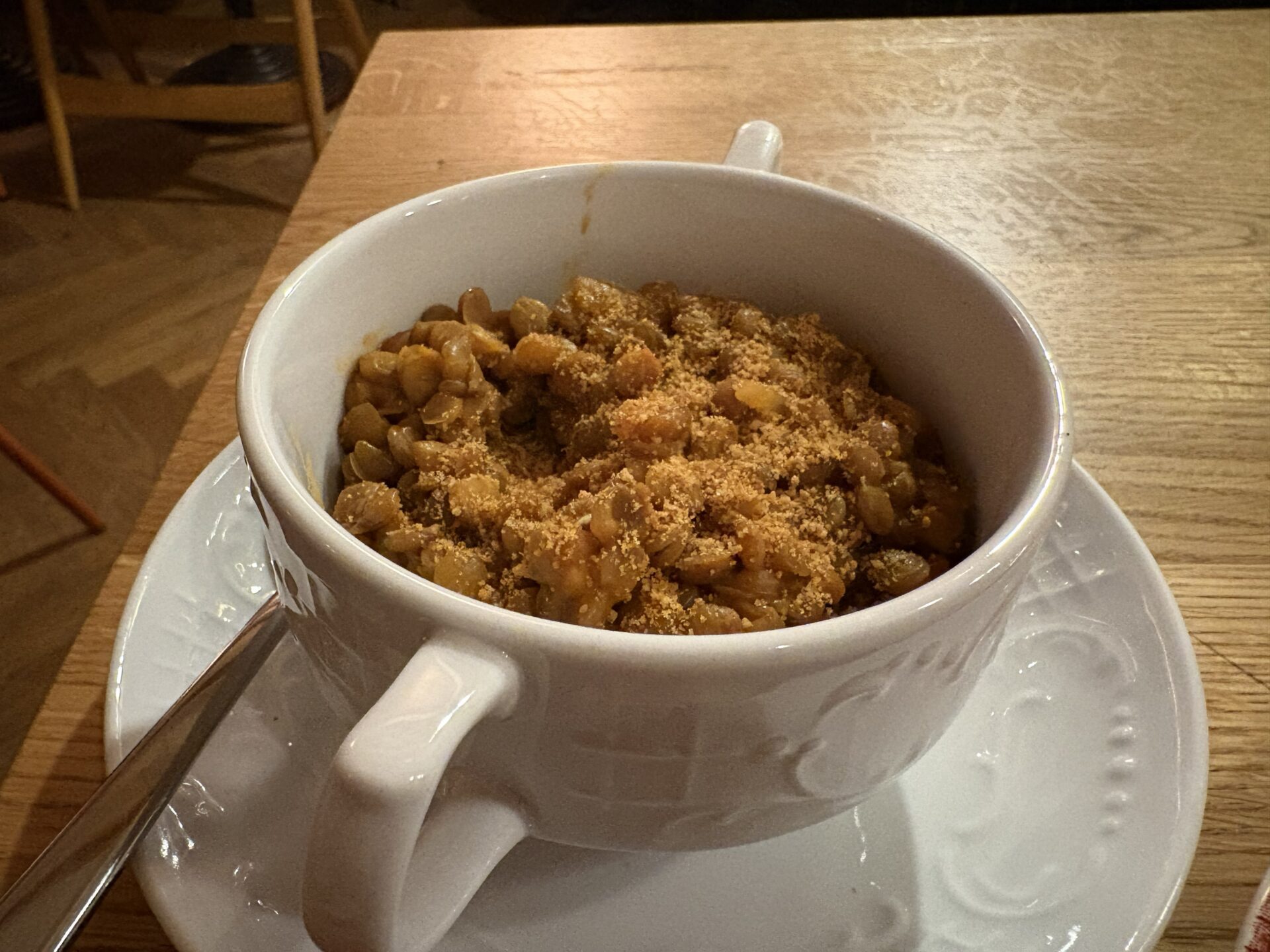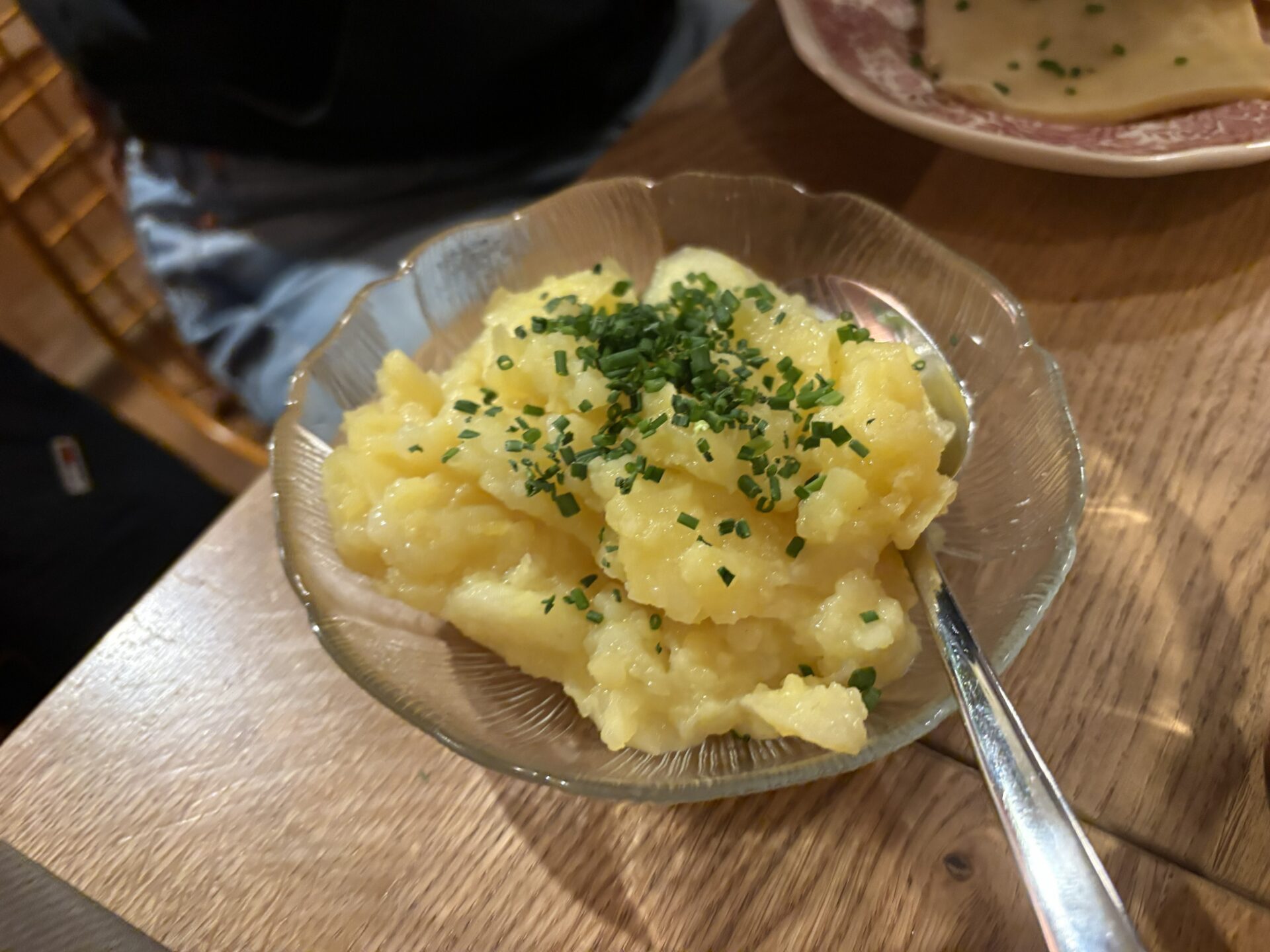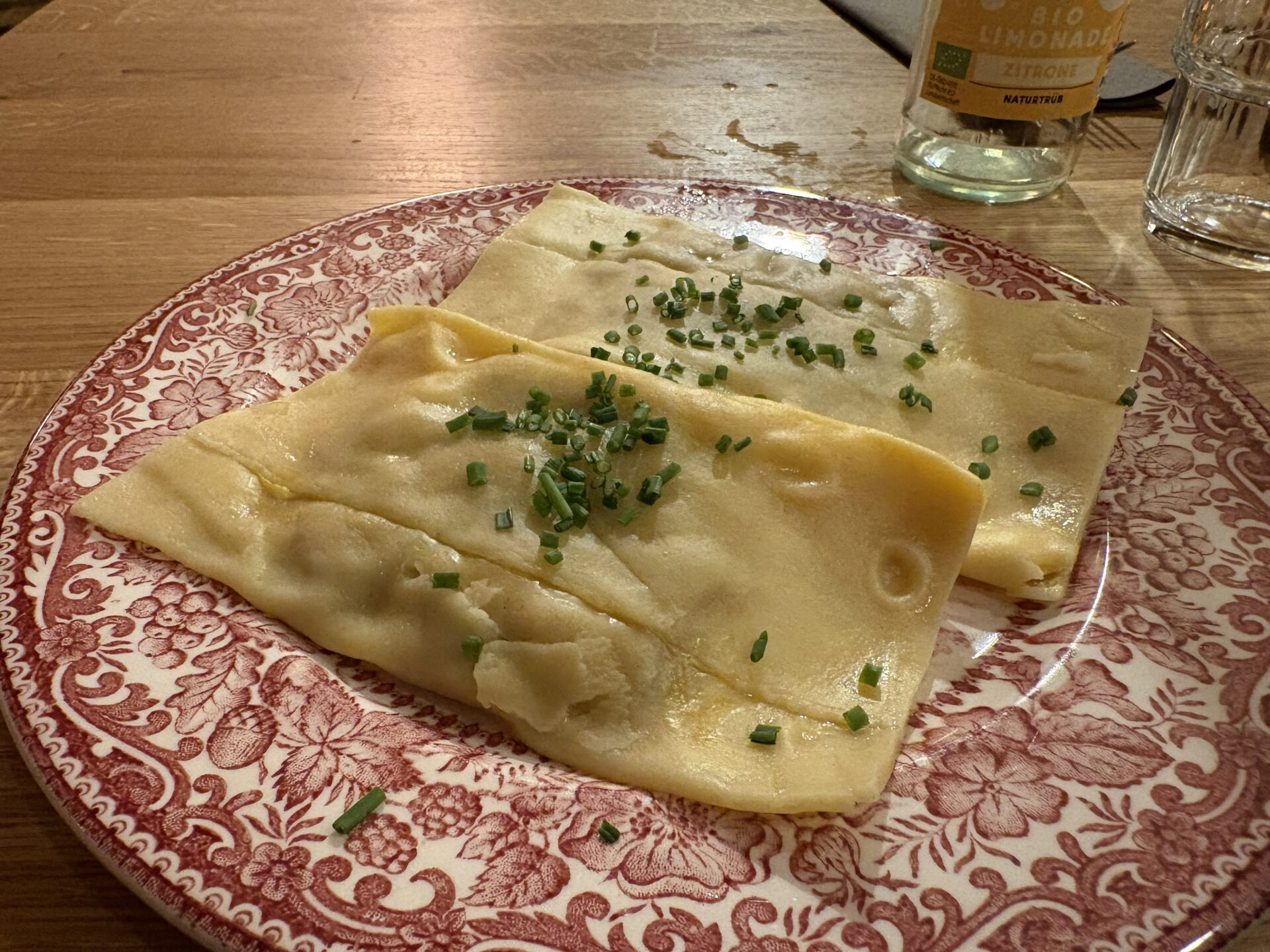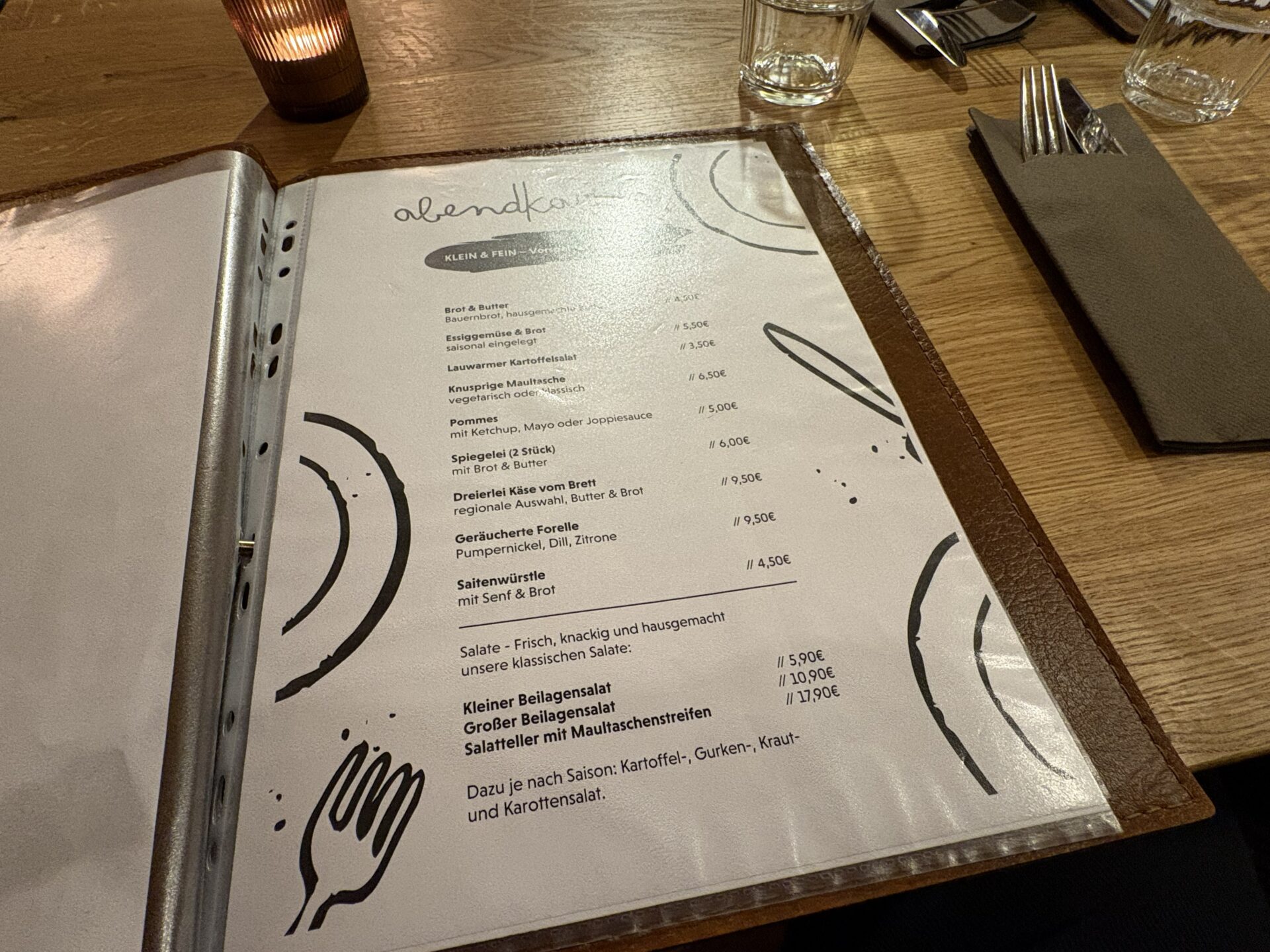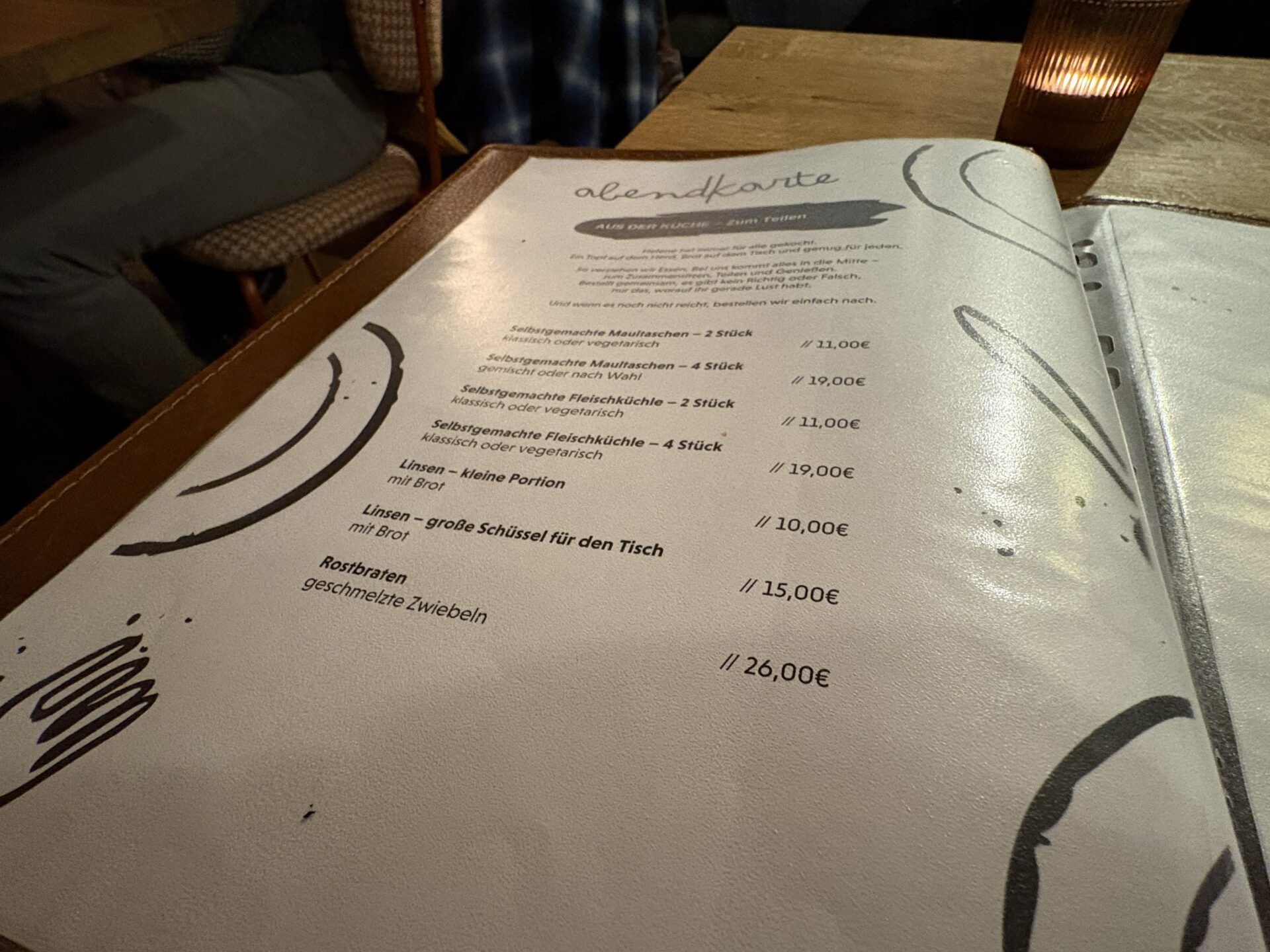 Alle Gerichte die einen Tisch mit drei Gästen erreichen, sind von Bodenständigkeit durch und durch geprägt, lecker gekocht und handwerklich perfekt. Was man nur noch selten erlebt ist auch das Pricing für die Speisekarten Positionen, welche überwiegend zwischen 10 und 20 Euro liegen. 2 Maultaschen klassisch oder vegetarisch für um die 10 Euro, die auch noch gut schmecken, der Teig bissfest, die Füllung vielleicht etwas zu kompakt. Dies ist kein Schönheitsfehler, es ist in gewisser Weise eine Perfektion von Großmutters Küche. Linsen mit Brot sind ein weiterer Klassiker, ja schon viele Jahrzehnte zurück gab es ausreichend Superfood und pflanzliche Proteine im Schwabenland, als noch die wenigstens sich darüber einen Kopf machten. Nicht zu vergessen ist der Essig-Öl Salat von der Kartoffel, er glänzt und schmatzt so wie es sein soll. Selbstverständlich das ein Zwiebelrostbraten auf der Karte steht und als Getränk stehen ausreichend gute Weine aus deutschen Landen zur Wahl.
